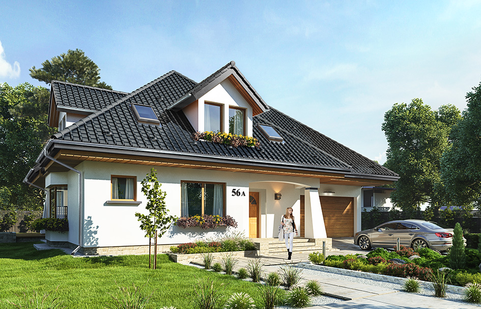 House plan Agnes 3B is a variant version of the house plan Agnes. The storey house plan with an attic, for 4-8 person family. The building consists of main body covered by a hipped roof decorated by three dormers and built another garage with boiler room. Architecture of the house is a combination of modern materials, details and colors, from the traditional form of the house with an attic. Agnieszka 3B is a representative and a magnificent house. The entrance was decorated with corner arcade with a gentle curve. From the garden we have a beautiful arcade partly roofed terrace and large glazed bay window of dining room and attic dormers. The interior of the house: on the ground floor we enter through atrium with a comfortable changing room, straight to the daily combined lobby, living room and dining room. It's very pretty and large open surface. From the front was placed kitchen with the island and pantry. From the hall are visible representative stairs and extra room (office or bedroom) with its own bathroom. From the locker room we can go into large garage and boiler room. On the attic are three bedrooms and two bathrooms. Children's bedrooms with wardrobes and parents’ bedroom with its own bathroom, dressing room and a balcony overlooking the garden. Above the garage we have two additional rooms and laundry facilities. Rooms for two hundred meter house is impressive - will fit in it, even a very large family. Agnes 3B house plan is compact and simple. The house is very well insulated, it contains energy-efficient solutions. You can easily customize it to the NF40 standard. The construction costs of Agnes B 3, taking into account the size of the house are low. The house will be a good option for people planning to build a large house with a spacious interior for the price.