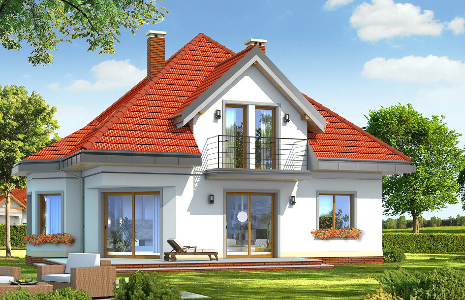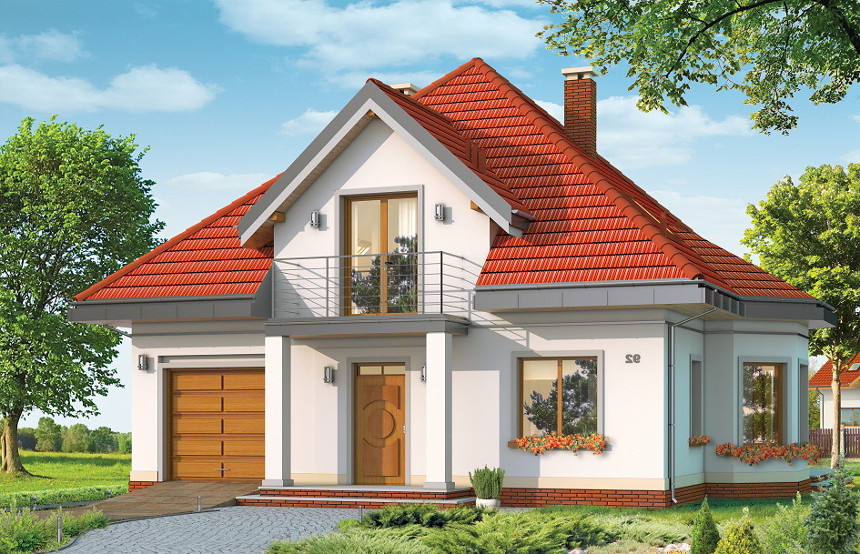 Agatha house plan is a project for a family of four or five people. This is a storey house with utility attic covered by envelope, hipped roof. House is designed in a quiet style with using traditional and modern details. Compact form of building with built-in garage, was decorated with dormers with balconies, bay window in the dining room, and corner arcades in the living room. Simple, clear body emphasizes the elegance of the external architecture of the building. In this house plan floor space was designed in such way that all the rooms surround a centrally located hall and stairs. The living area constitute hall, sitting room, dining room and a kitchen – this rooms create one open interior, however, they are partially separated from each other. In the utility part on the ground floor is designed garage, boiler room and an extra room (it can also be adapted for extra room – e.g. cabinet). On the top floor there are three large bedrooms with dressing room and built-in wardrobes, and a spacious bathroom - bathing room. On a small area we are managed to design a functional interior with spacious rooms. Agatha house plan is also available in a mirror version.