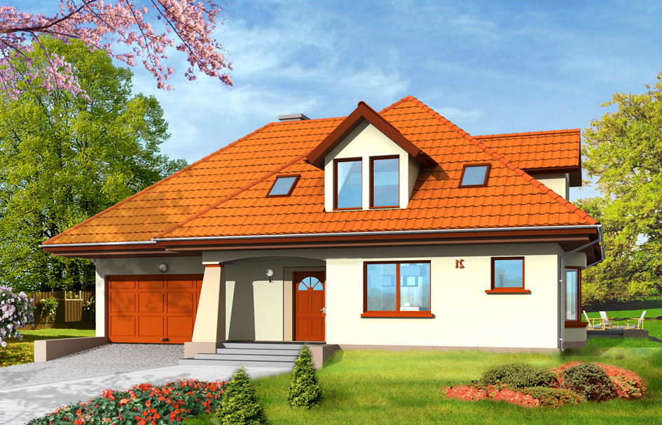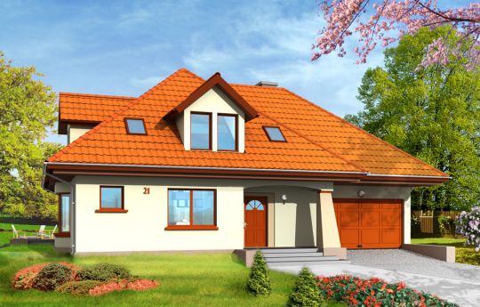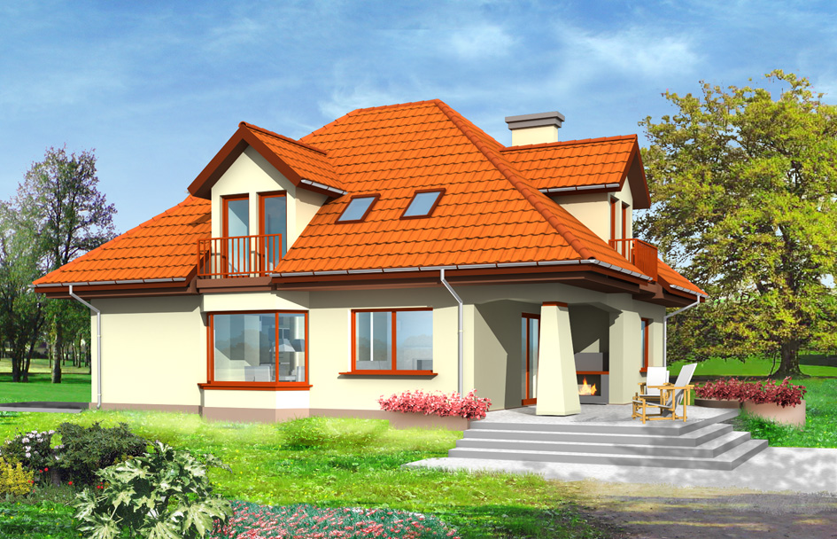 Agnes house plan has been created for a young family with children – this house plan is attractive on the outside and functional in the inside. The arcade supported by column with buttress give the entry presentable appearance. The bay window of the dining room and arcade with outdoor fireplace decorate the house from the garden. A hipped roof with dormers and balconies, diversify the body of the building. The interior of the house has a large living room, large garage and functional bedrooms in the attic. Agnes house plan is also is also available in a mirror version