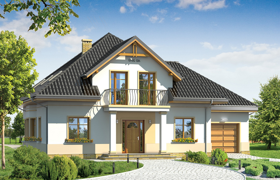 Amanda is a house plan for a family of 4-6 people. Amanda is the house with an attic, covered with a hipped roof. This house plan is a modern suburban villa with a quiet architecture. Compact body of building with build on garage and a large covered arcade on the back of the house, was curiously decorated with clinker and wooden Elevation facade, loggias and entrance arcade. Massive decorative internal and external fireplace chimney, or corner windows – are additional decorations of the building. Architectural thought out body of building creates a cohesive and calm compositionally whole. On the ground floor a large living room with dining area and lobby, with a partially open kitchen and an extra room - study or guest bedroom was designed. On the top floor are bedrooms, with a separate parents apartment, with its own bathroom, dressing room and balcony overlooking the garden. In the Amanda house plan, through the wide glass on the ground floor, the exit from the living room to large arcade and a garden terrace was planned. Amanda house plan is also available in a mirror version.