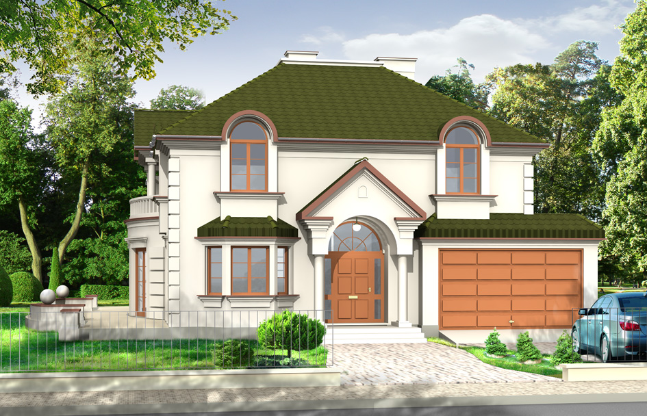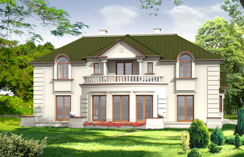 Ambassador house plan is a large, elegant, two-story house for the family of 4 to 6 people. Architecture of this house expresses a sense of stability and comfort of a higher class. In this house plan, thanks to the entry-designed on the side of shorter-elevation there is a possibility of adaptation to the plot with a garden on the side. A rectangular block of the house with the garage built up and ornament entrance portico formed despite the multitude of details bright and clear interior layout and plan. The exterior view was subordinated to alignment and aesthetics while the interior is extremely functional..