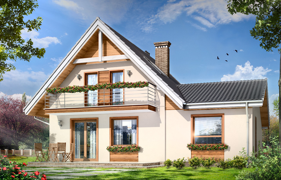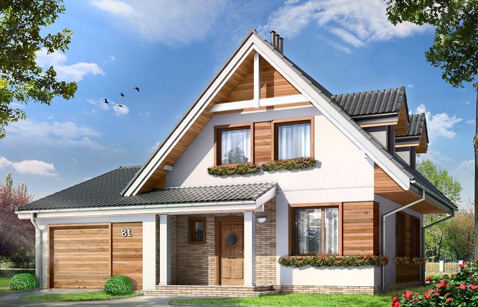 Amelia house plan is a small one storey house with attic for family of 4 - 5 people. The house was covered by gable roofs, in this house plan a garage has been also foresees. The simple, unpretentious body of the building was confronted with a modern, economical detail, which adds elegance to the house. Additional the decoration of the house are pieces of the facade finished with wooden Elevation and clinker. On the ground floor, besides to the one space of living area, with living room, hall, open plan kitchen and centrally located stairs, extra room (e.g. a bedroom or study), a garage and a private bathroom with a place on the central heating boiler was designed. There are also design three bedrooms with private bathrooms at the attic. Despite the small area this house has a number of functions - in a few house plan of this size you can find four bedrooms and a living room, two bathrooms and a spacious garage. There is also a mirror version of the this house plan.