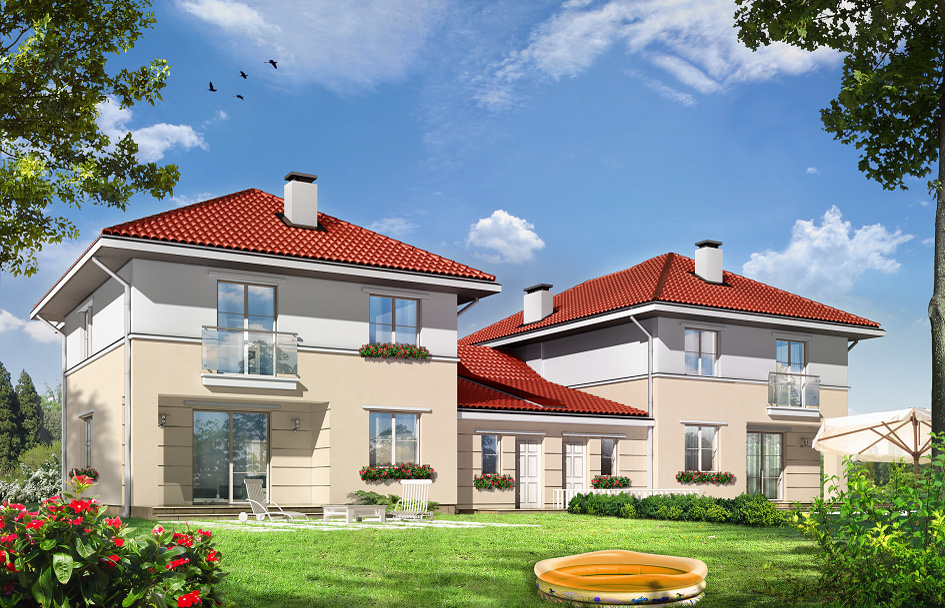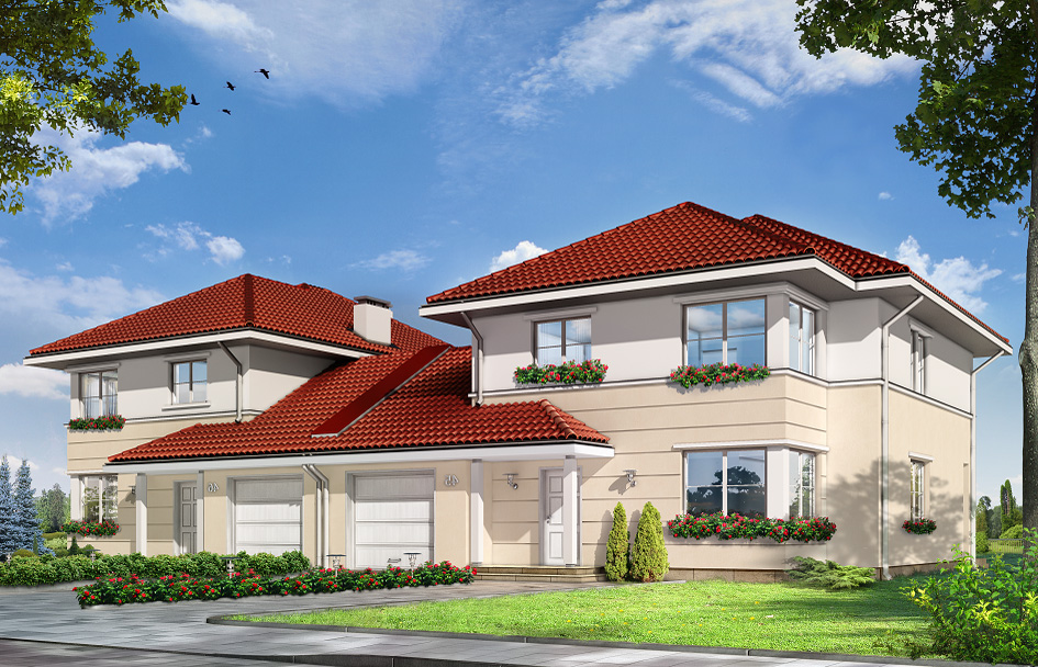 Amethyst 2 house plan is a semi-detached house for the family of 4 to 6 people. This storey house was covered by the hipped roof. This house plan is a compact, easy to build body of the building, composed of the two two-storey halves connected by the one-story garages connector, has been also varied by wall fragments with the rustication, and two arcades. The subtle decorative elements add the Amethyst 2 some discrete elegance. The interior was designed with the clarity divisions – no needless space. All rooms have a functional shape. On the ground floor living room with dining room and lobby, with a partially open kitchen was planned. There is also an extra room - study or guest bedroom. In the usable part of the house there is also double garage and utility room - you can also opt out of the garage and in its place design a large utility room. On the first floor there are three bedrooms with dressing-room and built-in wardrobes and a large bathroom. It is also a possible to save up additional fourth room on the first floor – by eliminating wardrobe. There is also a mirror version of Amethyst 2.