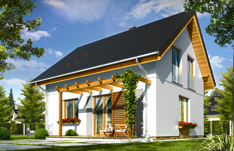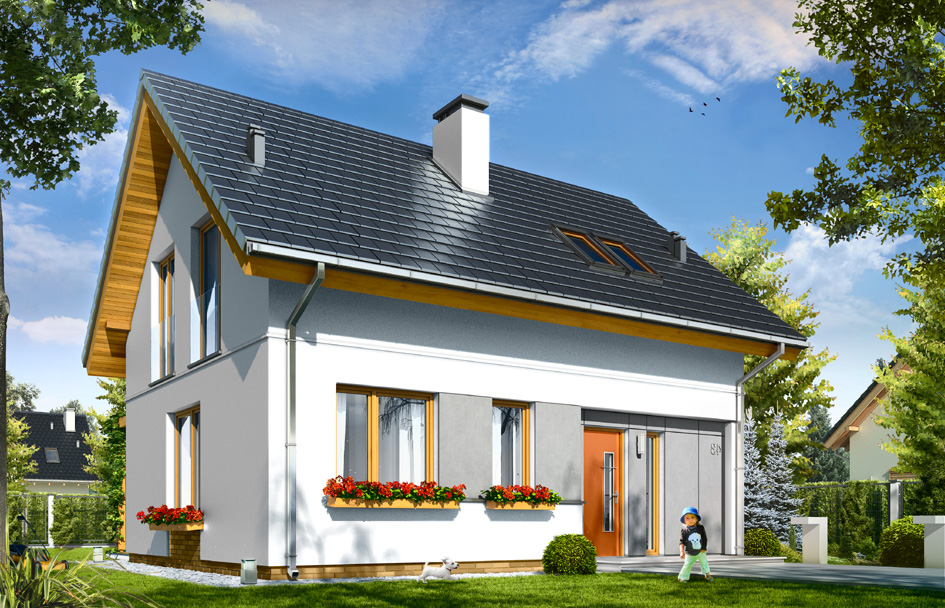 Anna house plan is a response to the need of a comfortable storeyed house. Who would not prefer to live in such a pearl instead of the three rooms in the block? Anna is a nice house with functional attic for a family of 3 - 4 people. His unpretentious architecture easily fit in with any surroundings. Simple modern architectural form built on a rectangular plan, a gable symmetrical roof, gives a sense of order and harmony. Thanks to the simple body of building the construction of the house is easy and inexpensive to build. Modern finishing materials and wall Elevation of the facade was diversified by the entrance arcade. The garden elevation is decorated with wooden pergola above a terrace available from the living room. The interior of the house as a small usable area is very spacious. There is on the ground floor: living area with lounge, kitchen, lobby with comfortable stairs, and an additional room (bedroom or study), bathroom and boiler (gas, which can be also a solid fuel stove). While at the attic there are three comfortable bedrooms with private bathroom. Thus, as a house with a usable area of 82 m2, Anna is a very functionally house plan. This is not the end of the advantages of the project. The house is very well insulated, and the modern systems and technologies make it energy efficient and cheap to future exploitation. The cost of building is very reasonable, because Anna has a simple structure and the correct ratio to the cubature to the amount of the external partitions. This is a perfect home for the frugal and conscious investors who are planning their future house tailored-made to his/her possibilities and actual needs. This house plan is a version without the garage, but it is very easy to design and build one or two cars garage to side elevation. There is a mirror version of this house plan.
