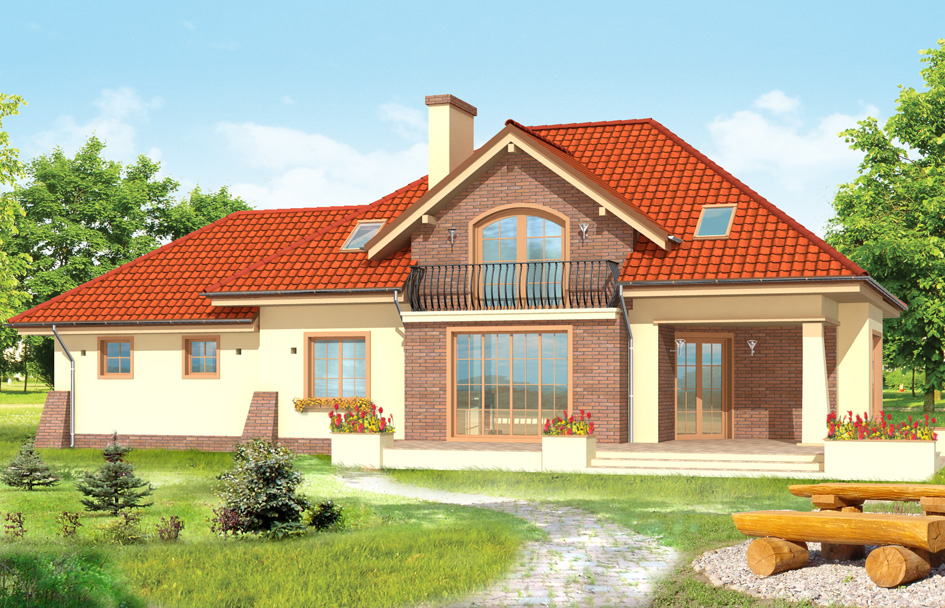 Benedict 2 is the family, one-storey house, with an attic covered by the hip roof with wide dormers. Architecture of Benedict 2 refers to a traditional Polish residence house, in the modern terms. Balconies, arched windows and large windows opening the living room to the garden, bay windows and corners of walls decorated with buttresses all this gives a harmonious, aesthetic, representative and welcoming body of building. The interior of the house is a large living room with a separate area for dining, semi-open kitchen, spacious hall with comfortable stairs, extra room and technical facilities of the garage. At the attic the children's bedrooms with dressing room and parents apartment with a separate bathroom was designed. In this house plan there is also possible to adapt the attic above the garage.m.