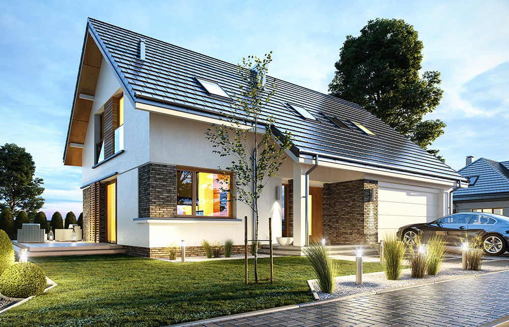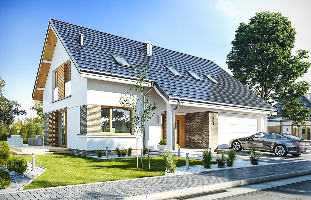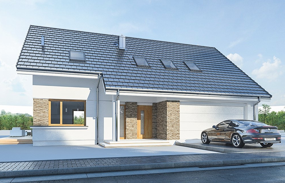 House design Biba is another version of the project from the collection of "dancing" houses, namely: Party, Party 2, Foxtrot, Rumba, Salsa, Samba, Tango. It is a variant version of the Party house plan, with sloping roofs. It is a perfect house plan for a plot where the local plan forbids using of flat roofs. Biba - is a one-storey single-family house, with an attic, perfect for family of four to five. Due to the additional room with a bathroom on the ground floor, it can also be suitable for a three-generation family, with seniors. In a more sensible and not too much space we have fit all necessary rooms. On the ground floor, we have a large open living space, connecting the living room with a fireplace and TV wall, a corner on the dining table, a kitchen, and a hall with representative stairs. Next to the kitchen there is a pantry with space for an additional fridge. The entrance to the house is planned through a spacious vestibule with wardrobes, combined with a garage. We enter the vestibule from the large entrance arcade, and then to the lobby with wide glass doors. You can find here also an extra room - a study or bedroom, and a bathroom with shower and a useful storage under the staircase. On the ground floor there is also a large two-car garage and boiler room. In the attic we have a three bedrooms: a comfortable parents' suite, with its own bathroom and a really nice wardrobe, and two children's bedrooms with built-in wardrobes, a bathroom and a laundry room available from the lobby. At the top, we still have a small attic. Taking into account the non-displaced floor space, the house has been able to design a truly comfortable interior. House has rather simple shape with a gable roof and large glazing combined with clinker and wooden cladding. The house will perfectly fit into any environment, and its architecture will certainly be timeless and will not get bored quickly. Thanks to the uncomplicated shapes, the house will be easy and inexpensive to build and then to maintain. The building was designed as energy-saving, also heating costs will not ruin the owners. "Biba" is a good solid offer for a single-family house for customers looking for a reasonable project.
