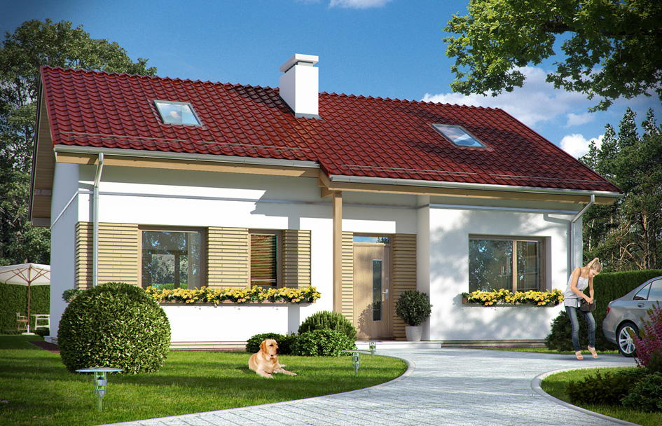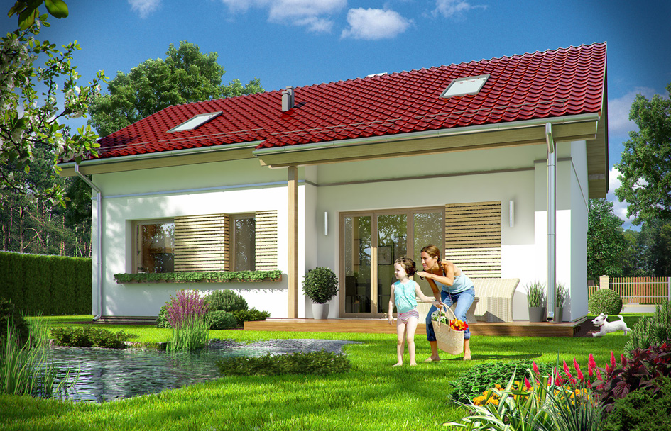 Ladybug 2 house plan is a variant version of popular house plan Ladybug. It is a small one-story detached house for the family of three – four people, covered by a gable roof with an attic to adapt. The house has a simple form and construction. It is easy to build and cheap to future exploitation. The house has a simple form and construction. It is easy to build and cheap to future exploitation. Thanks to the very good thermal insulation and modern installations, Ladybug is more energy efficient building. External appearance is a combination of modernity with traditional form. Modern finishing materials and architectural details connect with the traditional form of one-story house on a rectangular plan, with a gable roof. Front and garden facades have been varied by roofed arcades, and wood wall Elevations. The original roof covered with a sheet, you can be easily replaced by tiles or metal roofing tiles. The ground floor of the house consists of a living area with lounge, kitchen, hall and two bedrooms with a bathroom. Next to the porch is a gas boiler, which can be easily changed to boiler room with solid fuel stove. Despite its small area the house has a spacious and comfortable interior. Ladybug house plan is a year-round house, it can also be used as a holiday home. The simple and easy construction will save you on construction costs. Ladybug house plan is certainly a reasonable proposition for the thinking customer.