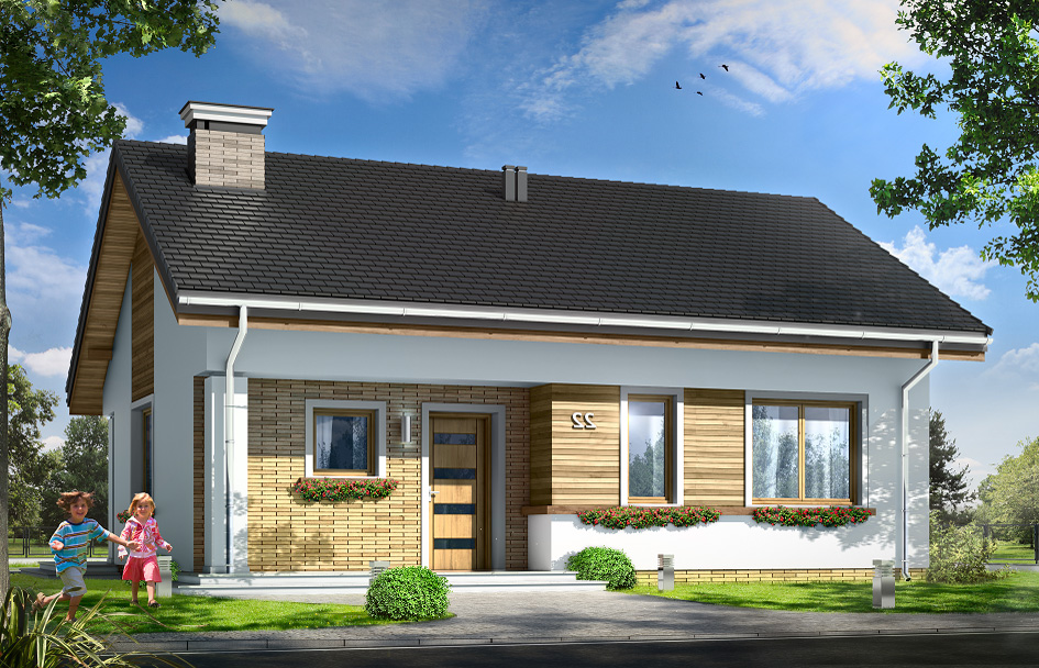 Boniface house plan is a small, family semi-detached house for the family of 3-4 people. The house is covered with a gable roof. Above the ground floor not usable attic was designed, which can be easily adapted to the attic with additional rooms. Boniface house plan, thanks to a simple block is easy and inexpensive to build. Nicely accented input platform, fragments of walls with wooden elevation and clinker tiles, an arcade and a garden terrace with a lovely corner window of the living room - all these elements make that we look to the house with pleasure. In the interior three rooms - two bedrooms and a living room, connected to the lobby and a kitchen with dining area were designed. There are also additional rooms, the boiler room available from the porch and bathroom. The attic, for which we enter by stairs from the lobby can be adapted to the usable attic, or it can be at all close by eliminating a staircase. There is also a mirror version of the Boniface house plan.