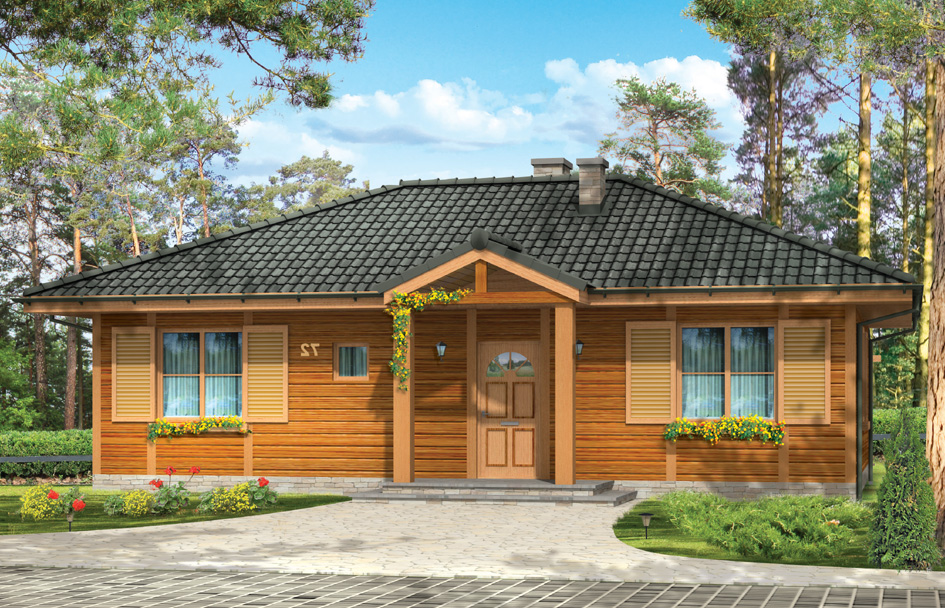 Booby house plan is a one-storey house from wooden bales, which could serve as a year-round home for a family of 4 - 5 people as well as a summer house. The construction of the house was on the inside insulated with mineral wool, so the building meets all the heat standards. The house itself, besides to a living room with fireplace and three bedrooms with bathroom has a large covered terrace, which can be partly glazed. In the utility room heating boiler was designed. Dudek house plan is also available in a mirror version.