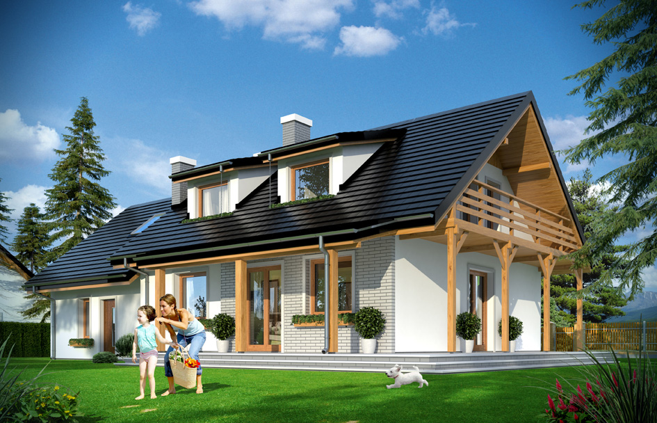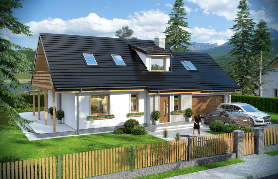 Breeze 4 house plan is a variant version of the Breeze house plan. Breeze 4, is a year-round, one-storeyed house with the usable attic, this house is perfect for a family for the 4-6 people. The simple body of building is covered by a gable roof. To the main body of building the garage part with a double garage has been build. The architecture of the house is a combination of modern materials and colors with the traditional form of the building. Thanks to this house perfect fit in any surroundings. The interior of the house is divided into a living area on the ground floor and bedrooms on the top floor. On the ground floor, besides to a living room with kitchen and hall (with stairs) an extra room - for example for a study, a comfortable bathroom, boiler room and garage for two cars, with utility room have been designed. On the top floor there are three bedrooms with the bathroom, and the attic. The attic in this house plan is treated as a no usable space, but it can be easily adapted for utility purposes. Thanks to that we will obtain one large extra room or two smaller rooms. The house has a simple construction, is easy with the building and inexpensive. Thanks to a compact body in it, you can get a good performance efficiency. Additional advantage of the building are two roofed, corner terrace this is something very useful on sunny as well as during the rainy days.
