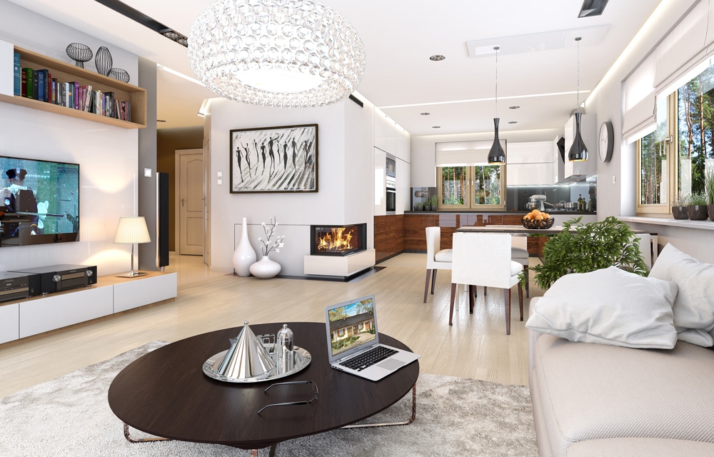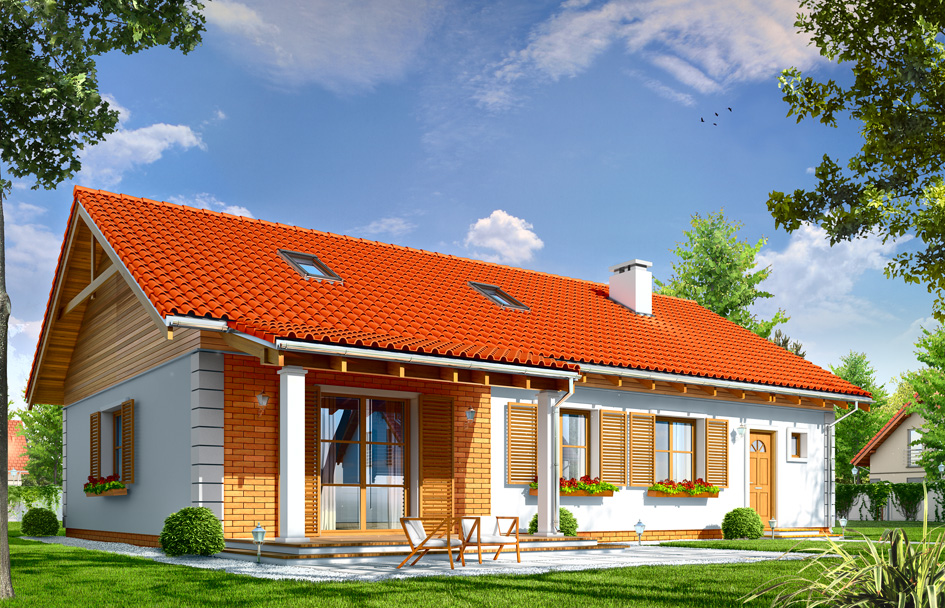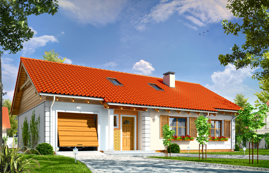 House plan Amber 2 is a new variant of the very popular house plan Amber, with a similar shape, but with changed function of rooms, and a concrete ceiling above the ground floor, raised roof, rafter trusses roof, and attic to adapt as usable attic. House has a compact rectangular block hidden under one roof for the residential part and the garage (which reduces the cost of the roof). On the ground level we designed everything what might need 4-5 people family. So we have a living room with an exit to the covered terrace, a corner fireplace and a TV wall, very nice and easy to arrange kitchen, separate comfortable hall, three bedrooms, two bathrooms. For this into the house we get very spacious atrium (provided with stairs to the attic), and in utility part of the house we have a convenient garage and a large boiler room with additional access to the garden. The house has extra space in these places where architects often stingy the surface, full-sized boiler room, large atrium or hall, which is just a part of the living room. We enter the house through the corner arcade. We get to the garden through a large covered terrace accessible from the living room. Above the ground floor there is a spacious attic that can be converted into a as usable attic. The compact block of the house, very good warming increase the energy efficiency of this house. House is easy to adapt to the NF40 standard. Simple design will make it easy to build. Thanks to a small area the house can be also qualified for the MDM program.