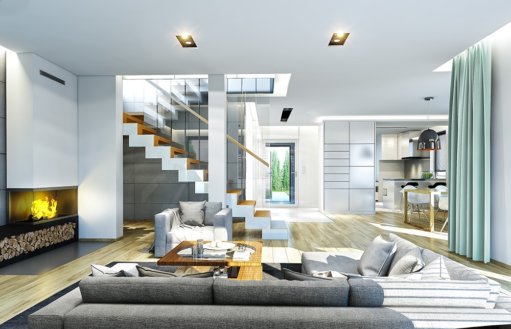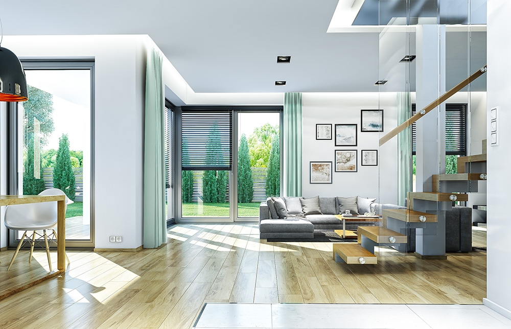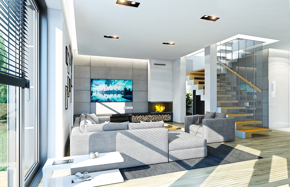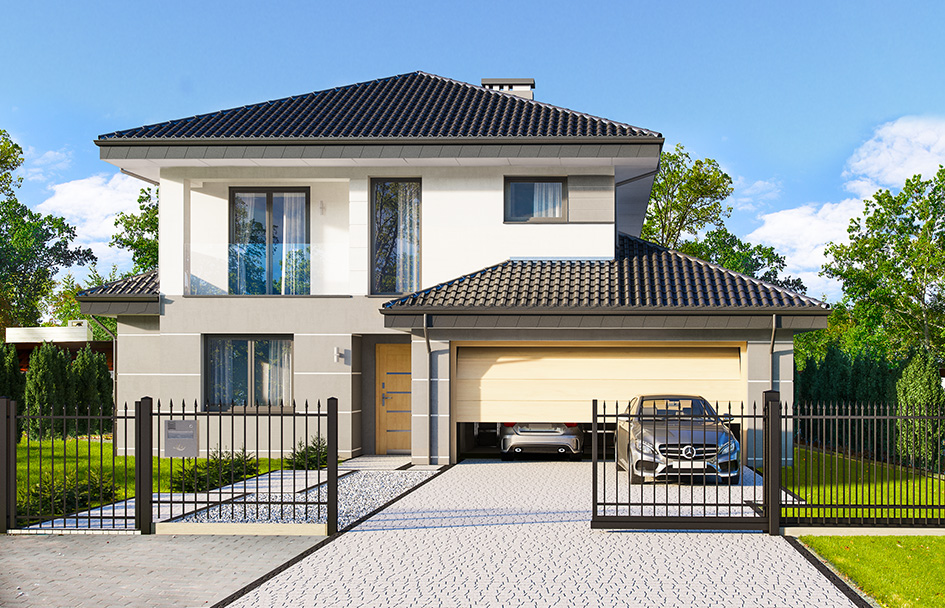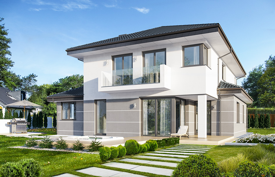 Cassiopeia 7 is a completely new house plan with the popular house plan Cassiopeia. This house plan is fundamentally different from the other houses in this collection and has a new original and modern architectural expression. It was achieved by combining the simplicity, savings additives and details and using interesting colors and materials. Cassiopeia 7 is a storey building, for the family of four- seven people. Body of the house is storeys, covered with a hipped roof, with build another single-storey part with double garage. Cassiopeia 7 is large, comfortable and prestigious villa, designed for investors who dream of freedom of space. At the same time the building has practically designed interior, and its construction is fairly simple and easy to build. Elevations of the house are divided into horizontal stripes. The lower ground floor strip has a gray rustication, walls of the first floor are white. Large windows, arcades and balconies also decorate the body of the building. The whole creates a modern and dynamic silhouette of the house. Interior: ground floor is primarily a really big living room, with dining room and hall, creating a large living space. At the entrance to the house from the front was designed a large kitchen with a table for quick meals. From the atrium we get to the double garage and the boiler room. Behind the stairs, slightly separated from the living room is located in an extra room with bathroom: office or bedroom hospitality. This can also be room for seniors. On the first floor was designed as many as four bedrooms and two bathrooms. Children’s bedrooms have built in wardrobes. Parents' bedroom is a separate apartment with its own bathroom, dressing room and a covered balcony. Cassiopeia 7 is a comfortable, functionally designed house, with a modern and representative architecture.