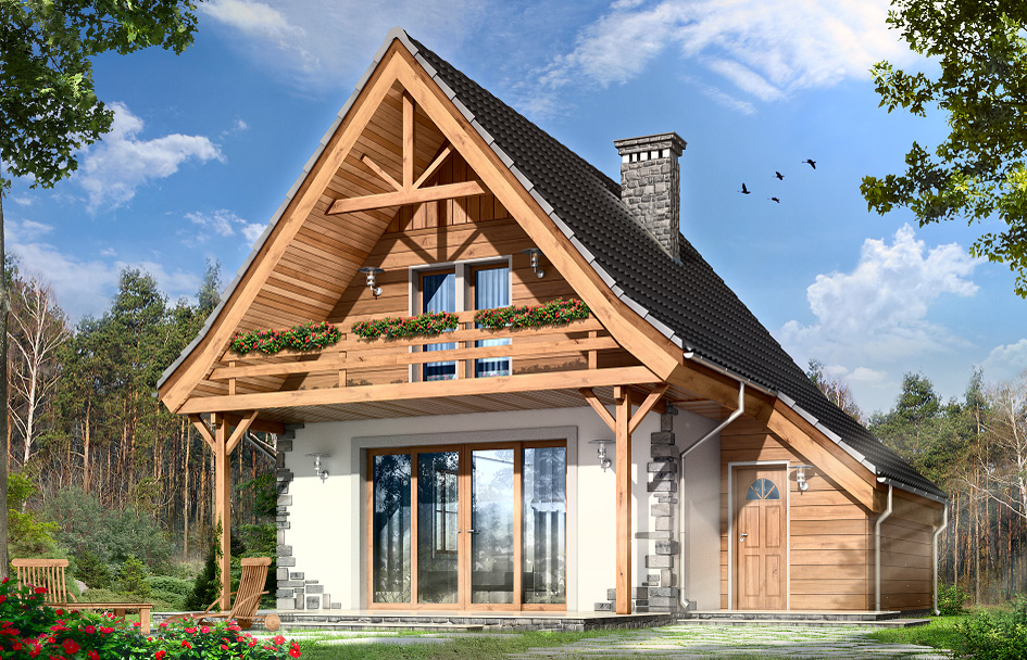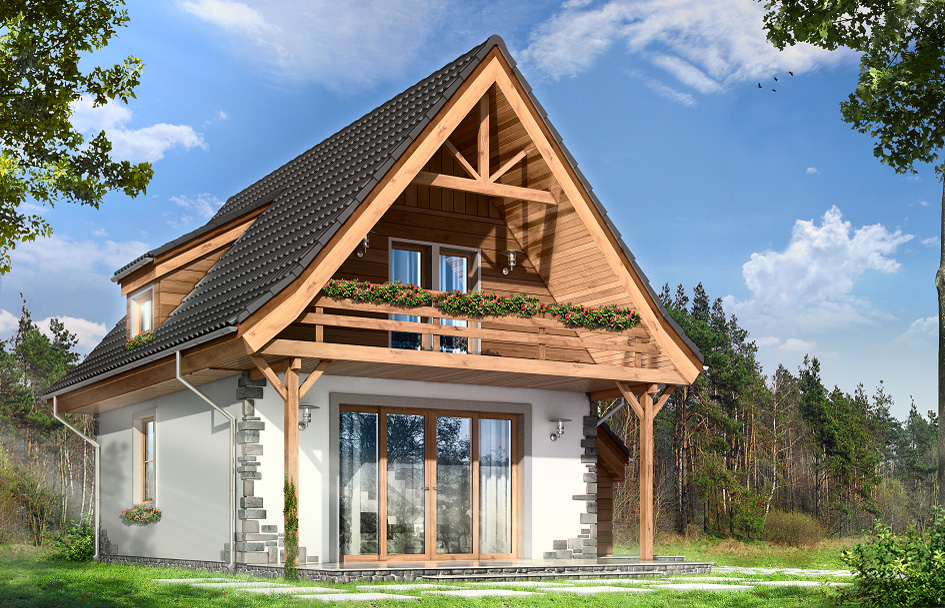 Cottage 2 is enlarger version of popular Cottage house plan. This is a single-family house for the family of 3-4 people. Cottage 2 can also be used as a summer house. The body of the house is covered by a steep gable roof. Large balcony and a covered terrace the from the garden side, and wide glass exit from the living room give a fantastic effect of the opening to the garden. A large amount of wood in the facade and stone Elevation is a delicate reference to the mountain architecture. At the same time the house has such a delicate line that will suite perfectly to any surroundings. Inside, the house on the ground floor there is a large living room with exposed stairs and a fireplace, semi-open kitchen, bathroom, boiler room with a central heating and a porch. On the attic there are three small bedrooms and useful toilet. There is also a mirror version of this house plan.