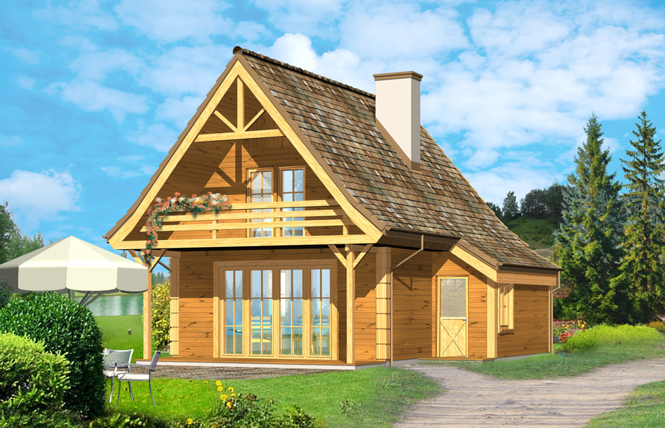 Wooden cottage house plan is a dream house perfect for recreational land or for year-round living. Despite its small area it is characterized by a functional interior and houses all the necessary facilities: at the bottom a comfortable living room with fireplace, kitchen and bathroom, at the attic 2 or 3 bedrooms. Under the big arcade hanging over the terrace, you can shelter from the rain or the sun, and from the comfort balcony you can admire the beautiful surroundings. This house plan is also available in the wood frame technology and brick version.