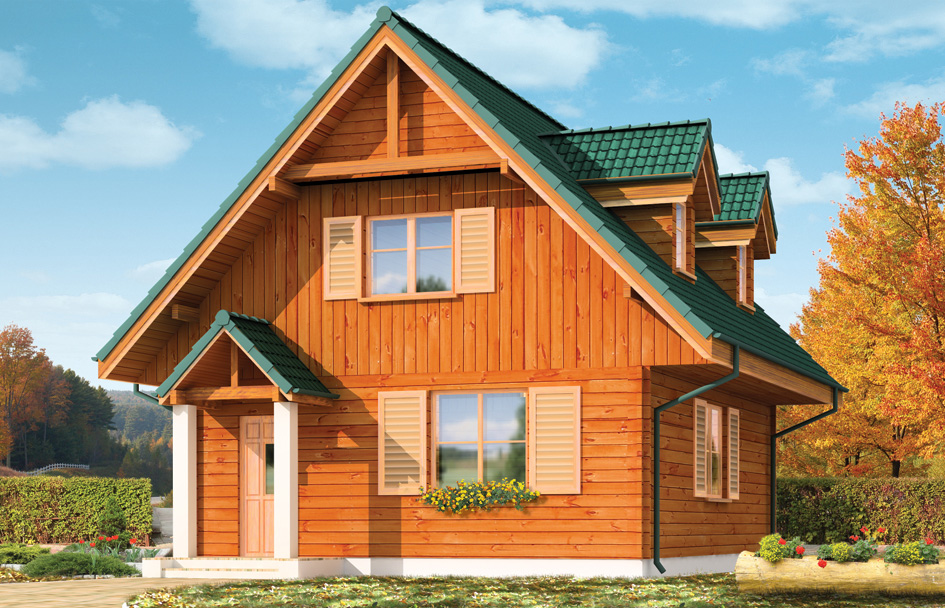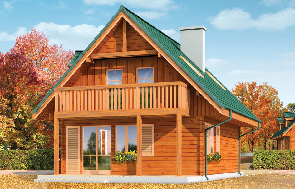 D03 wooden Gregory is a detached single family house or a comfortable holiday house. This is a building of a simple body, covered by a gable roof. It fits perfectly to the plot with a garden behind the house - from the back elevation a large terrace, partly covered by a large balcony has been designed. The front of the house is accented by a gable wall and a protruding lump of the entrance porch. Despite the small area the house looks impressive. Wooden elevation from the balls can be replaced with plaster, it is possible to make a mixed elevation: plastered ground floor and a wooden attic. Interior: on the ground floor a large living room with fireplace, open to kitchen and hall with stairs is designed. In this house plan on the attic there are three bedrooms and a bathroom. The two of rooms have a balcony.