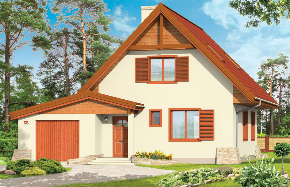 D03 with garage house plan is the expanded version of the D03. To the original house plan the garage and utility room which could serve as a boiler room was added. On the ground floor is a large living room with fireplace and open kitchen. On the attic three bedrooms was planned. There are two versions of heating - gas boiler and solid fuel. There is also a mirror version of this house plan and a variant of the utility room behind the garage and dormer windows in the roof.