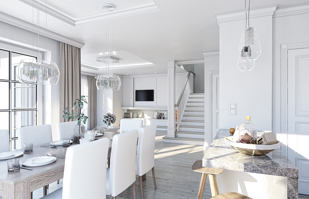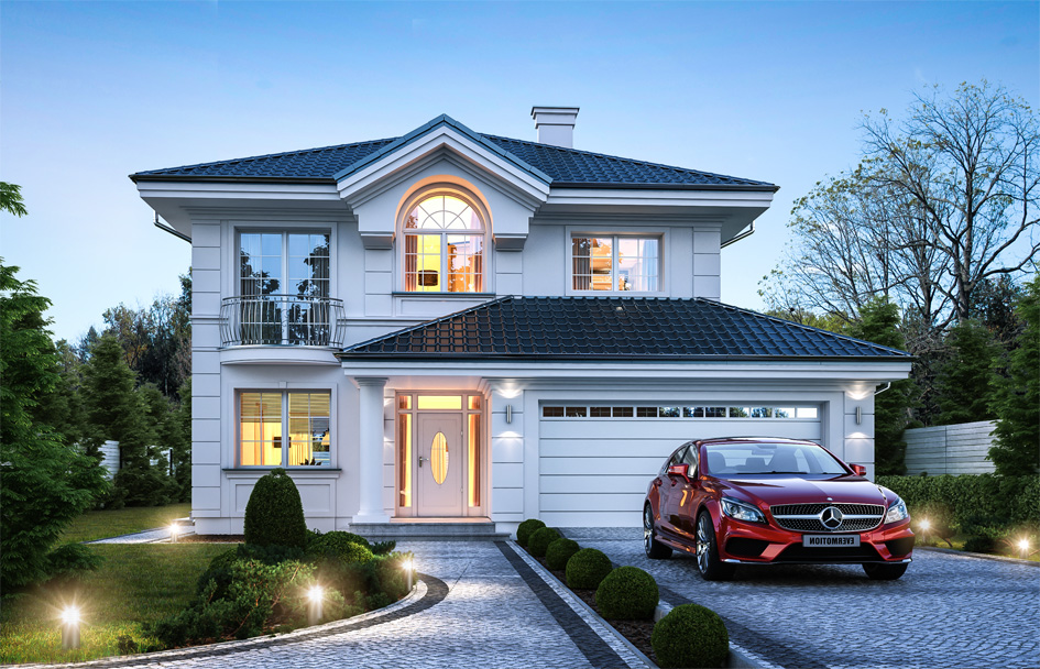Diamond Villa house plan, was born in the head of one of our clients. The customer called us one day and said: "You have a nice one-story houses from the Willa park series, or a house on the park, but I would like a two-story house, not too big, best similar to the Emerald project, but with classic architecture and appearance like Park Villa. We decided to fulfill this wish and in this way a new project was created: Diamond Villa, which is a combination of the architectural style of our classic one-storey villas and residences, with the function and shape of a small storey house, suitable for a smaller, urban plot. We hope that you will like the design. The exterior of the house is an elegant villa with decorative details. The interior, on the other hand, is a functional stacked cube, using every square meter of the building. We enter the house through a beautiful decorative door with side lights to the vestibule, and from there to the hall and the living space. The monumental arched window on the first floor underlines the representative character of the front of the house. The whole is complemented by a kitchen window and parents' bedroom (with a balcony).In the interior on the ground floor we have a living room, kitchen and dining room, connected with each other. The living room is open with wide glazing to the terrace and garden. From the dining room, sliding doors lead to the arcades and the terrace. Comfortable two-story stairs are an additional decoration of the interior. On the ground floor we still have a garage for two cars and a large boiler room with technical exit. On the first floor, three bedrooms have been designed: a parents' bedroom with a dressing room, and children's bedrooms with built-in wardrobes, as well as an additional room (office) and a bathroom. The house, despite its small size and compact body, is very functional. It contains four rooms on the first floor, which is rare at this area, not to mention a double garage. The building will fit on a narrow plot. House - contrary to appearances - is simple to build, has a simple body. The building was designed from energy-saving materials - it will be inexpensive in later operation. A diamond villa is a perfect proposition for investors who need a story house, but who dream about beautiful classical architecture, who do not want to duplicate the trumped patterns of a modern story. This is a house for everyone who dreams of such a mini-residence.