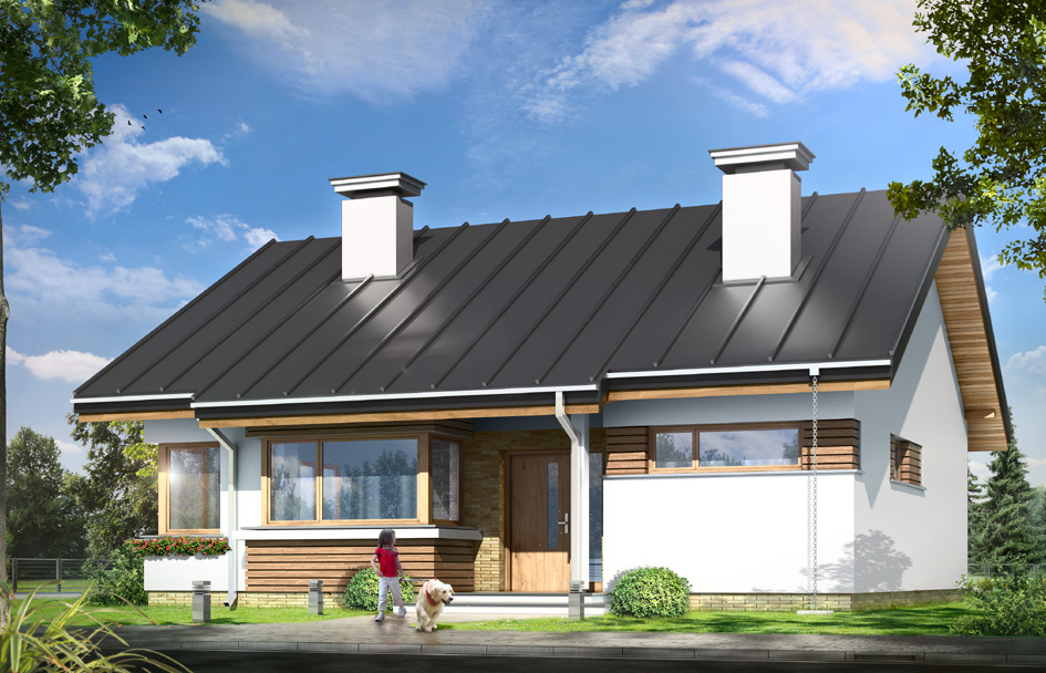 House for three is a modern small house for the family of 3 - 4 people. This is a bungalow, covered by a gable roof. On the rectangular ground floor plan a spacious living room with dining area, combined with a partially open kitchen and hall was designed. Next we can find two bedrooms, bathroom and toilet, and a wide porch and a boiler room. From the porch by stairs you can get to the attic. In this house the attic is not usable, but you can easily adapt it to the attic with additional rooms. Nice large interior, a large part of the utility room this is something what distinguished this house from other small house plans. Outside the entrance to the house was highlighted by the arcade platform and bay kitchen window. From the garden wide glass doors from the living room to the terrace and garden was designed. The terrace is partly covered by arcade. Extras in modern style, as a fragments of walls cladding by wood forming together with windows division of the elevation into strips. Corner windows emphasize a modern but not pretentious architectural character. There is also a mirror version of this house plan