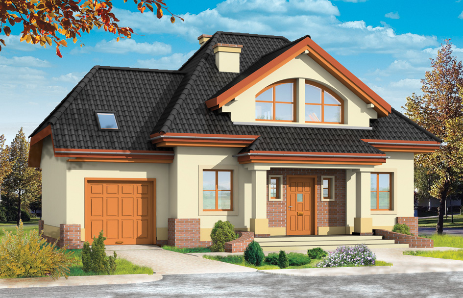 House on a medal 2 is a single version of the House on a medal, with a roof ended by pediment over the garage part. This is house plan is perfect for a family of 4 - 5 people. This house can be built even on a fairly narrow plot. Undivided interior of living room with dining area and lobby, and an extra room with a bathroom on the ground floor, and with three comfortable bedrooms on the attic (with minimal slants), create a comfortable place to live. In addition, the interior there are several auxiliary rooms - dressing rooms and lockers. The attic above the garage can be used as an attic or living space. There is also a mirror version of House on a medal 2.