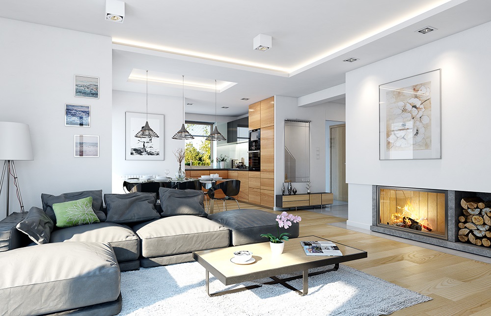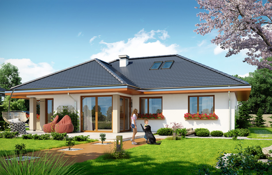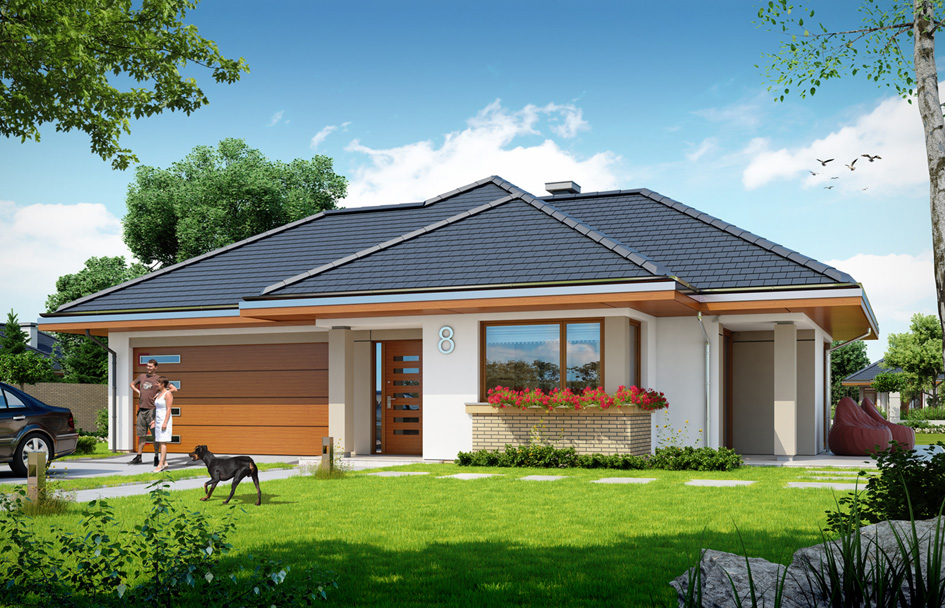 Tailor-made house 2 is enlarge variant version of Tailor-made house. It is a storey house for a family of 4-5 people - version with double garage. The building is based on a rectangular plan with a protruding part of the living room with arcade and garage. House covers hipped roof with a slope of 30 degrees. Above the interior of the ground floor lies considerable attic, possible to adapt to the usable attic. The house is suitable for a narrow plot, and in particular on the plot with the entrance from the south. Thanks to directing windows of living room and bedroom on the side elevation and partly on the front of the house, the interior is well lighted. Side and pulled out to the front garden will be properly sunlit. House has modern materials and solutions, interestingly arranged windows, arcades, corner windows, wall coverings, and varied roof. It is complemented by a functional interior of the house. The house has a modern look. The main body and details create an interesting and quiet architecture. The interior of the house is divided into parts: the living area, bedrooms and storage part. We enter the building from the atrium straight into the hall with stairs to the attic. Open daily space, of a living room, dining area and kitchen creates large living interior. At the back there are also three bedrooms with wardrobes and built-in wardrobes, bathroom and separate toilet. Convenient garage for two cars and economically and storage space complete the interior of the ground floor. At the top we still have a large loft that can serve as a house storage, or it can be used for utility purposes - to choose from. The house has uncomplicated design and compact shape. It should be inexpensive in construction and subsequent maintenance. Tailor-made house plan is energy efficient - has a very good insulation of partitions.