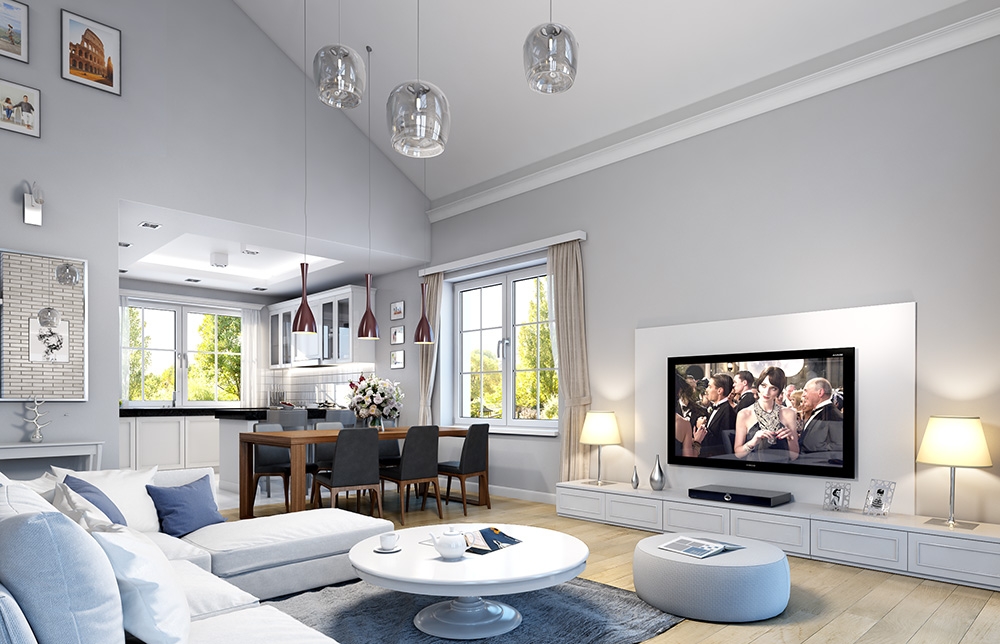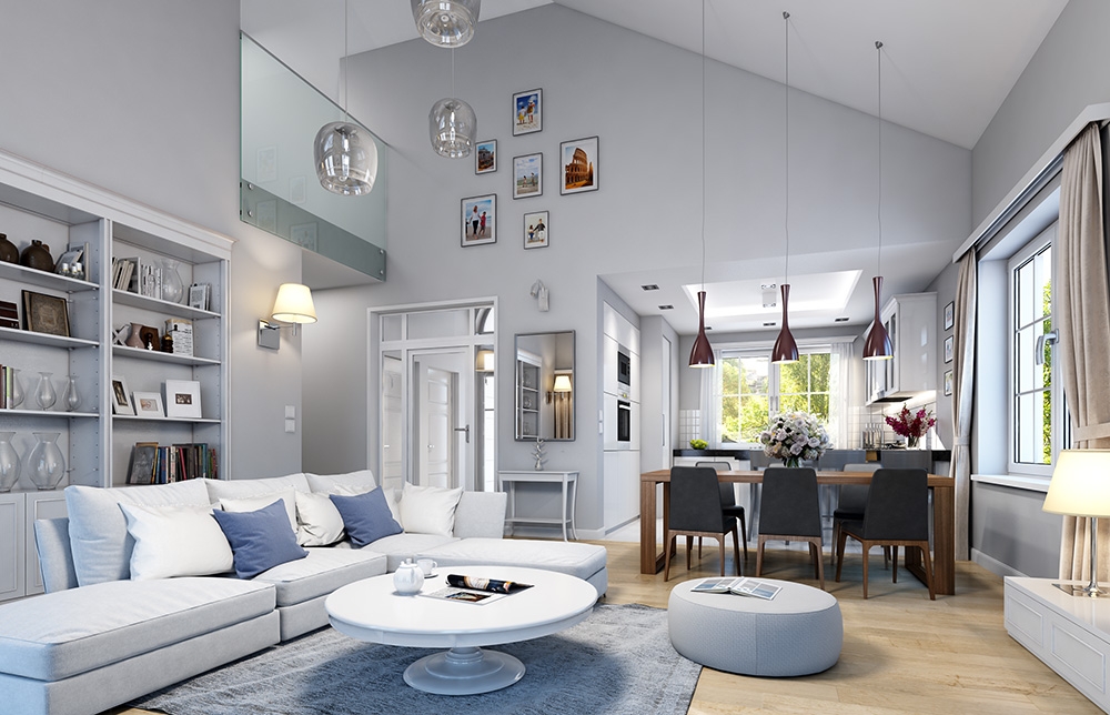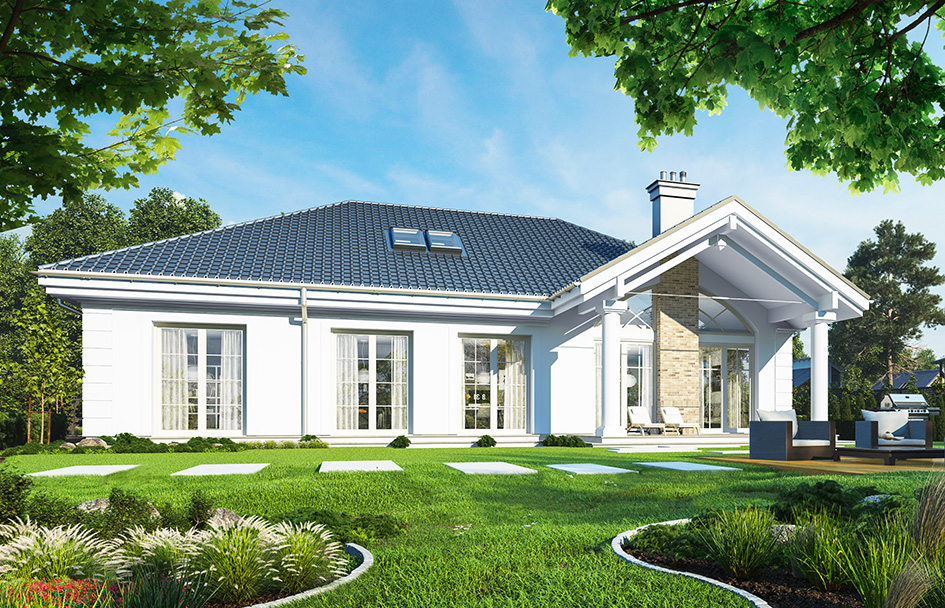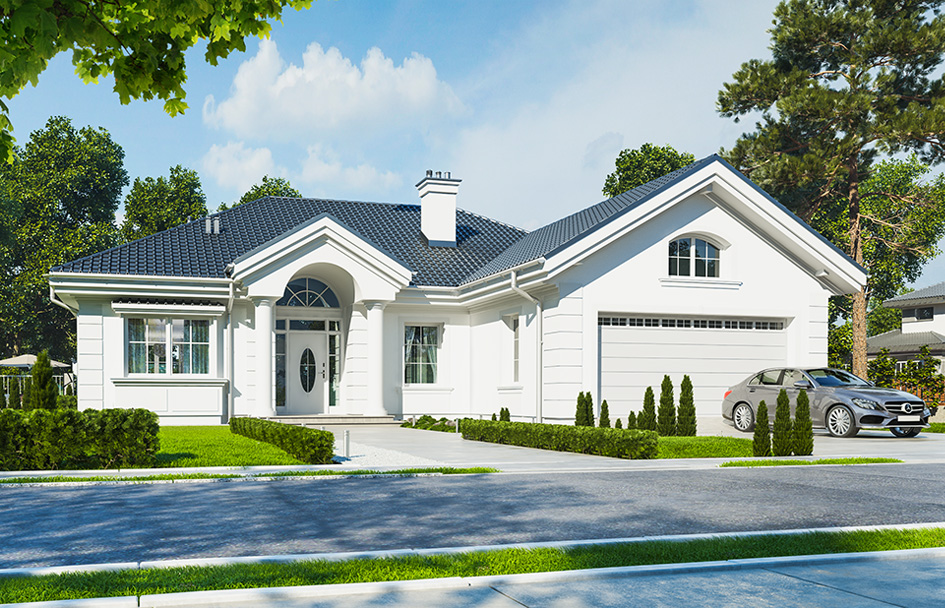 House on park street is another version of the house plan Park Residence – Park Villa. This time it is the smallest version of the project. House with a small area, small external dimensions and not high costs of construction and operation, is smaller brother of a larger Residence or Park Villa. The building was designed as a rectangular main body covered with a hipped roof, with build another garage. Representative front of the house, remaining the American residences of the rich suburbs, is decorated with beautiful, supported on columns, roof over the entrance door. This is the central element of the front elevation focusing all the attention. Similarly, from the garden: the main component decorating the facade is beautiful roof over the terrace and large glass of living room. Architecture of house is full of classical details, at the same time is calm, toned down, without exaggeration. This creates an elegant house with a timeless design. Interior: All living areas are located on the ground floor of the house. The attic can be developed as an additional usable space, or it can be left as an attic. We entre to house by a beautiful spacious hall with cloakroom, and higher ceiling, from which we get to the lobby or to the boiler room and the garage. Opposite the entrance we go into the enter open daily space, combined with living and dining area, and a separate beautiful kitchen with a pantry. Above the living room the ceiling was opened to increasing living space. The opening can be combined with a mezzanine in the attic. In the second part of the house there are three bedrooms, toilet and bathroom. Children’s bedrooms have built-in wardrobes. Master bedroom has its own dressing room. All bedrooms have beautiful windows overlooking the garden. Above the garage there is an additional utility attic. The house is simple in construction and energy efficient. This is an excellent option for those wishing to have traditional manor house architecture, but intending to spend less money to build, or do not have a large plot.