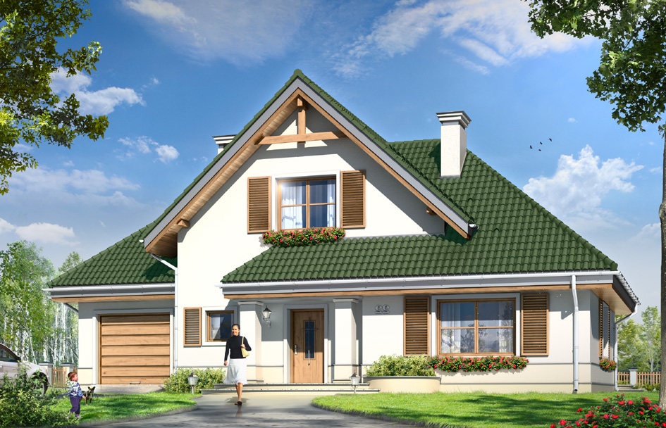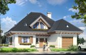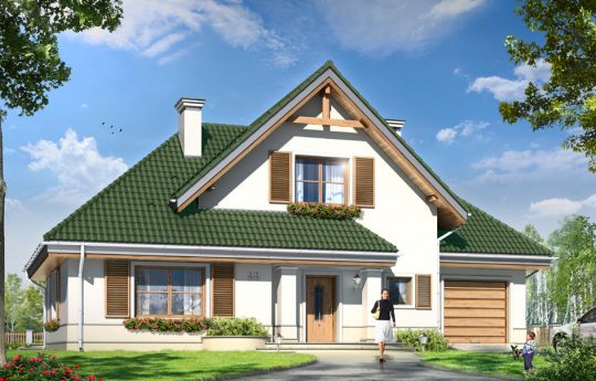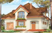 House in birch-trees is a building for a family of 4 -5 people. This one-storey building with usable attic, was designed on the set of "L" letter with built of the garage. The house is covered by a gable roof, and composed with the two three-fall roofs. The solid of building was decorated with arcades and balconies. The whole creates an attractive, slightly spreading silhouette of the of a suburban villa, with low coming down from eaves of roofs that’s allow to preserve the human scale of the building. Interesting solid of building, carefully chosen details and finishes, result in a very successful appearance of the house. The interior of house includes the living area, the utility and extra room on the ground floor, and three bedrooms on the attic. On the ground floor a hall is connected to the lounge, dining room and kitchen and form a common living space, open by wide glazing to the terrace and garden. A little hidden extra room can serve as study or an extra bedroom. On the top floor there are three bedrooms with a slight slants (thanks to the high elbow wall of the main solid of the house) and two bathrooms, including one accessible from the parents' bedroom. There is also a private quite large wardrobe in the room above the garage. There is a mirror version of this house.