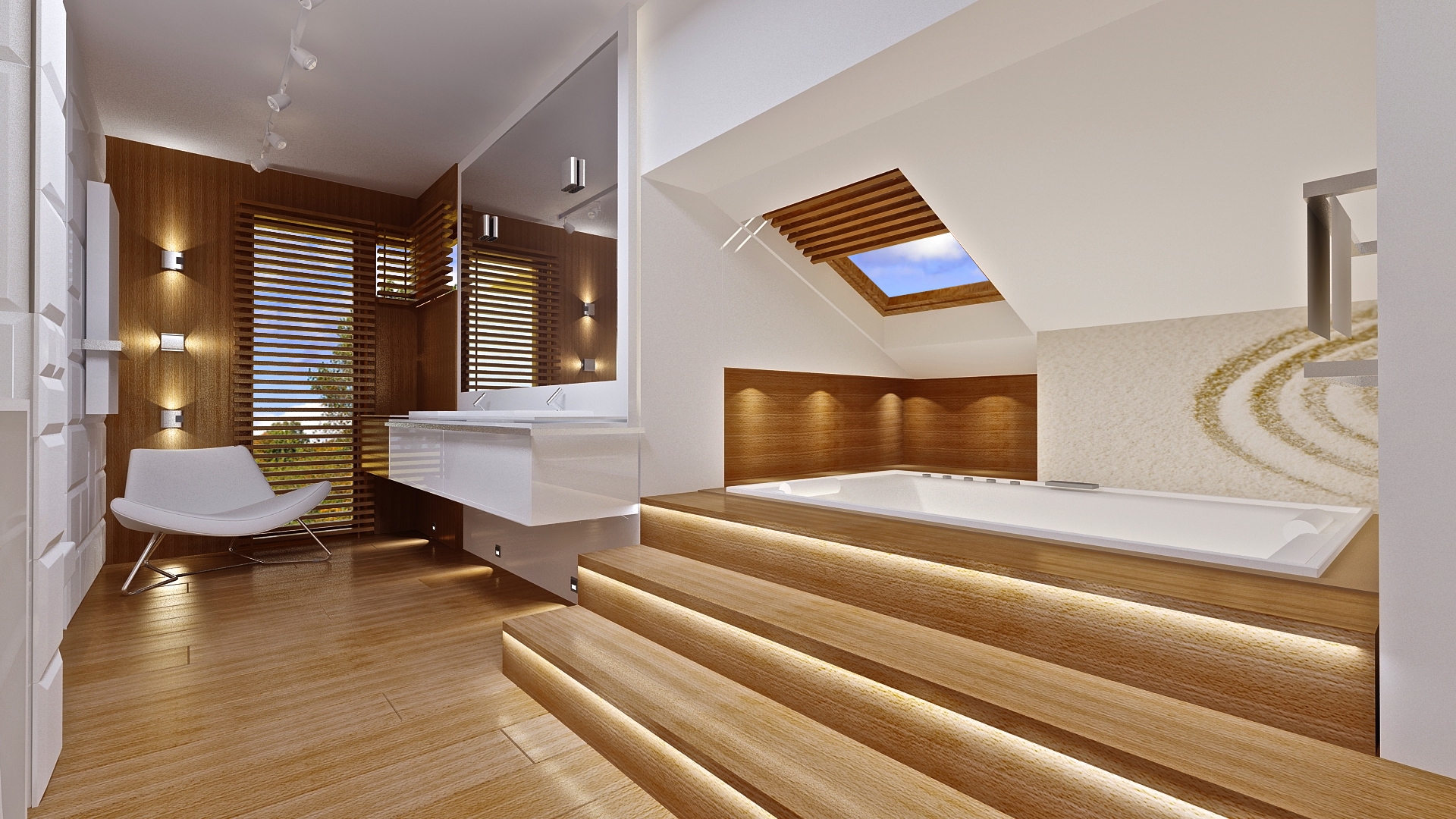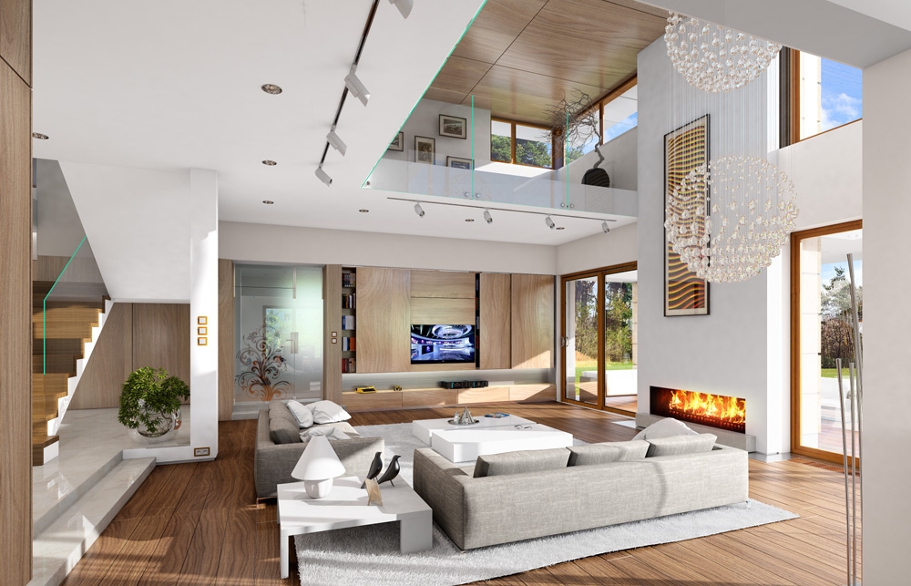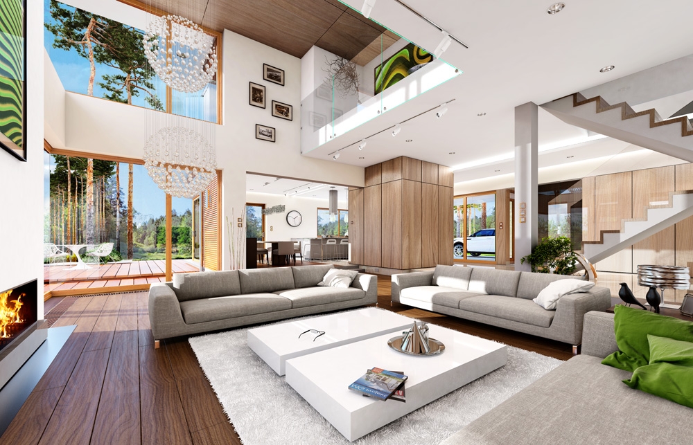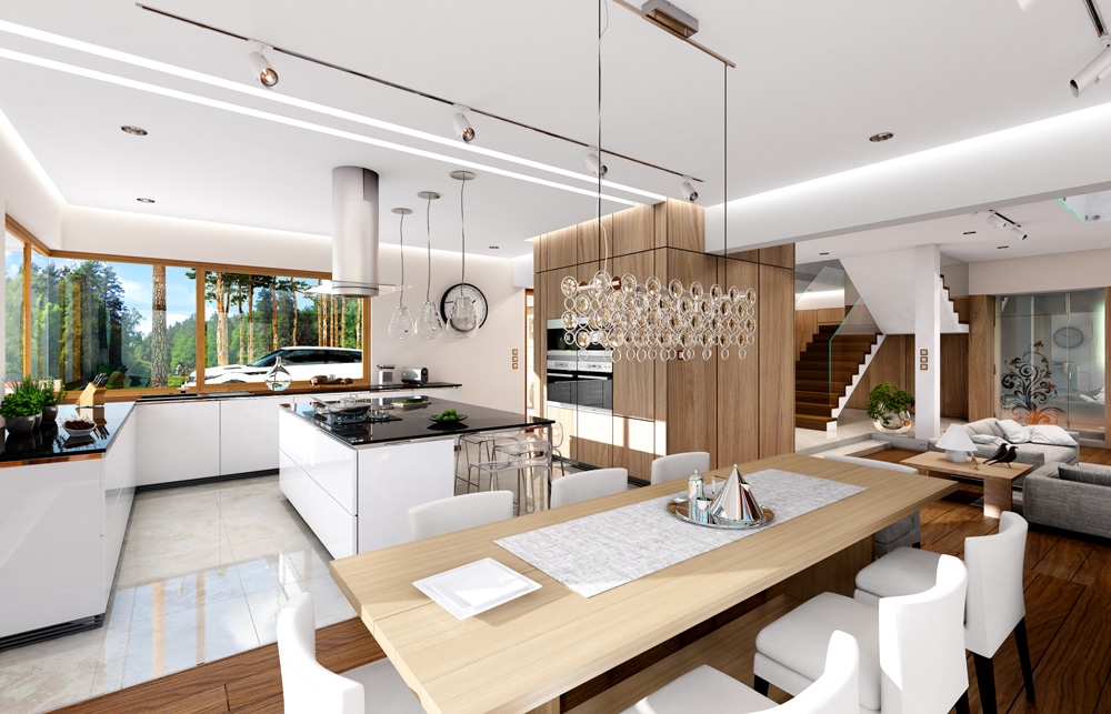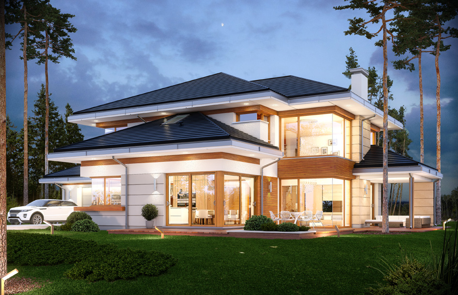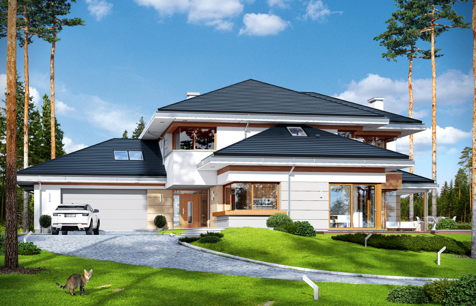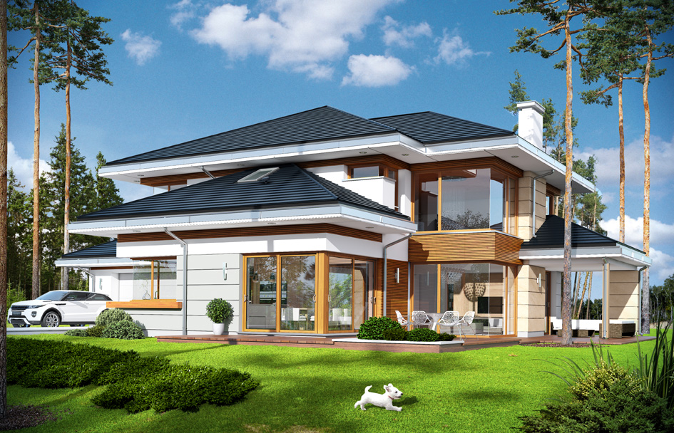 House with a view is a luxurious modern villa, for a family 4 – 6 people, to build on a plot of unfavorable relative to the location of the world. The house was designed as a spreading storey residence, connecting with surrounding garden and numerous glazing and with open and roofed terraces. Block of the house consists in a substantial part of first floor and the three ground floor wings forming in the letter "T". The house plan is so universal that it can be placed on each plot. The entrance part and the terrace part from the living room create two separate semi-open courtyards: front and garden. Large corner windows with rare divisions are a card house. The elevation is varied with numerous details, sandstone cladding, rustication plaster and wood trim. The whole is covered with a soft roof with wide eaves. The house has a modern but toned architecture. It is quite and elegance. Thanks combination of good details house architecture never gets old and does not go out of fashion. One of the main attractions of the villa are the glazing and the biggest attraction is the two-storey glass corner of the sitting room, connecting living room with empty space with a terrace and garden. Other glass: in the dining room, the kitchen, bedrooms, or at the entrance to the house is further enhanced by the effect of the interior openness. The space is a luxury! The interior of the house were designed according to this thought. The ground floor is a large open living area - living room, dining room, hall, kitchen. On the ground floor there is an extra room - study or guest bedroom. On the top floor there are bedrooms of parents and children, with bathrooms and dressing rooms. The first floor has a large entresol above the living room which can be used as an extra room. House with a view is a house plan for special people, with vision, with the desire to live in an extraordinary surroundings of beautiful interiors.