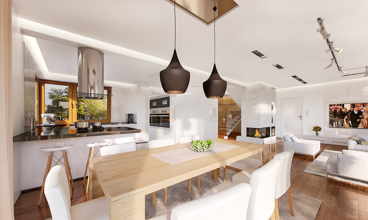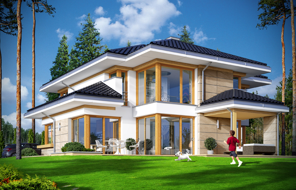 House with a view 3 is a variant version of the popular House with a view. The house has been quite substantially reduced, the surface is less than 30%, similar as the cost of construction. However, house did not lost on the elegant appearance and functionality of the interior. House was simply "slimmed" there where it was possible. In result we obtain an elegant small town house. House is dedicated in particular to the difficult plot with unfavorable orientation of entry in relation to the sunlight - with a garden on the side or on front of the house. Architecture of the house is a peaceful modernity, with matching harmoniously finishing materials and details. One of the main attractions is here beautiful corner window in the living room and the emptiness above the mezzanine. This is an essential fragment shaping whole interior. Complemented by glazed spacious porch, partially open kitchen separated by rectangular body of pantry and representative stairs connected with the fireplace wall. On the ground floor there is dining room, extra room (office or guest bedroom), bathroom, boiler room and garage with extra storage space and upstairs your own attic. On the first floor there are three bedrooms, including parents' apartment with its own separate bathroom and dressing room, second bathroom and mezzanine - library. The interior provides everything what might need 4-5 people family for comfortable live. House with a view 3, thanks to a terrace and an arcade, blends beautifully with the surrounding garden. Large glass additionally open house to nature. House was designed to be energy efficient (very easy to adapt it to the standard NF40). The ratio of surface area to obtained effect is very beneficial here. The house will be inexpensive in future exploitation and the construction itself will be significantly less costly than the basic House with a view. There is available different versions of this house: mirror variant, variant deeper of 100 and 120 cm, with changed layout of rooms on the ground floor and first floor, heat pump and adaptation to the NF40 (House with a view 3 variant B), version of the medium-sized (House with a view 2 ), and comfortable version (House with view 4).