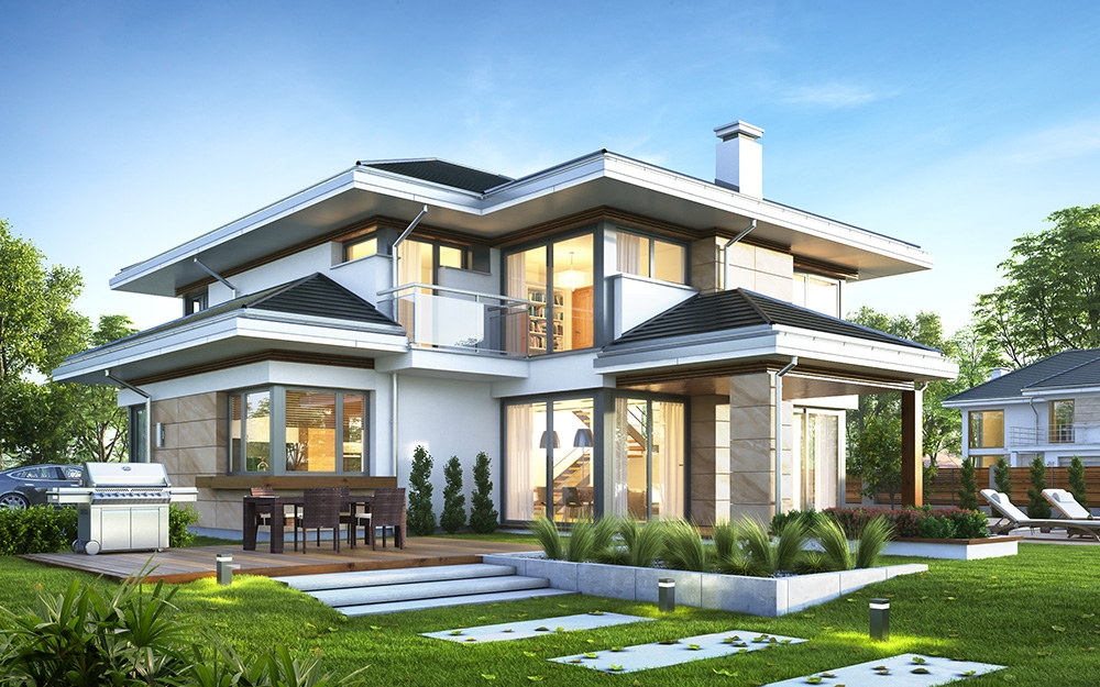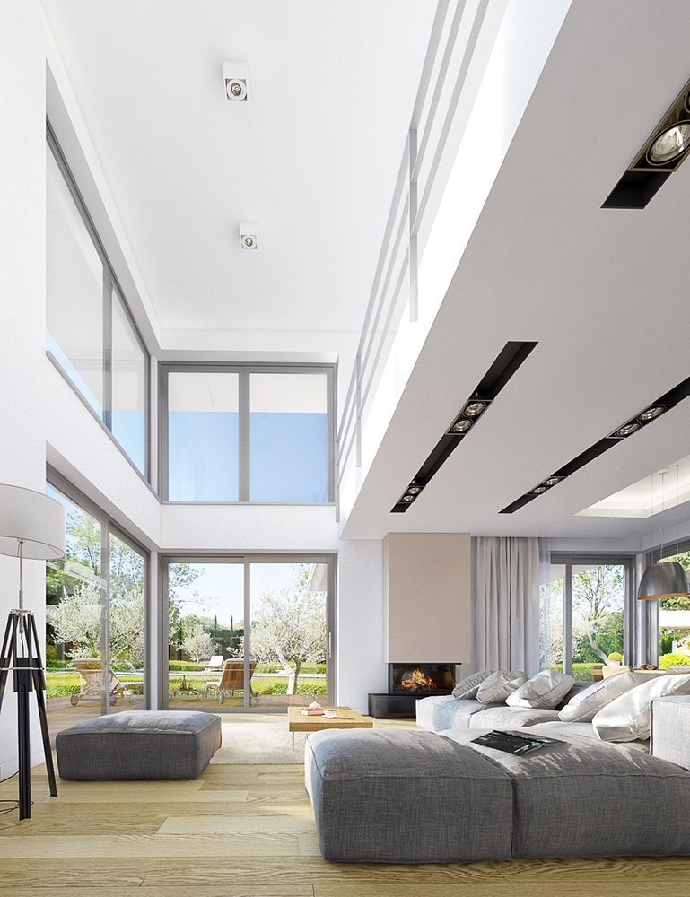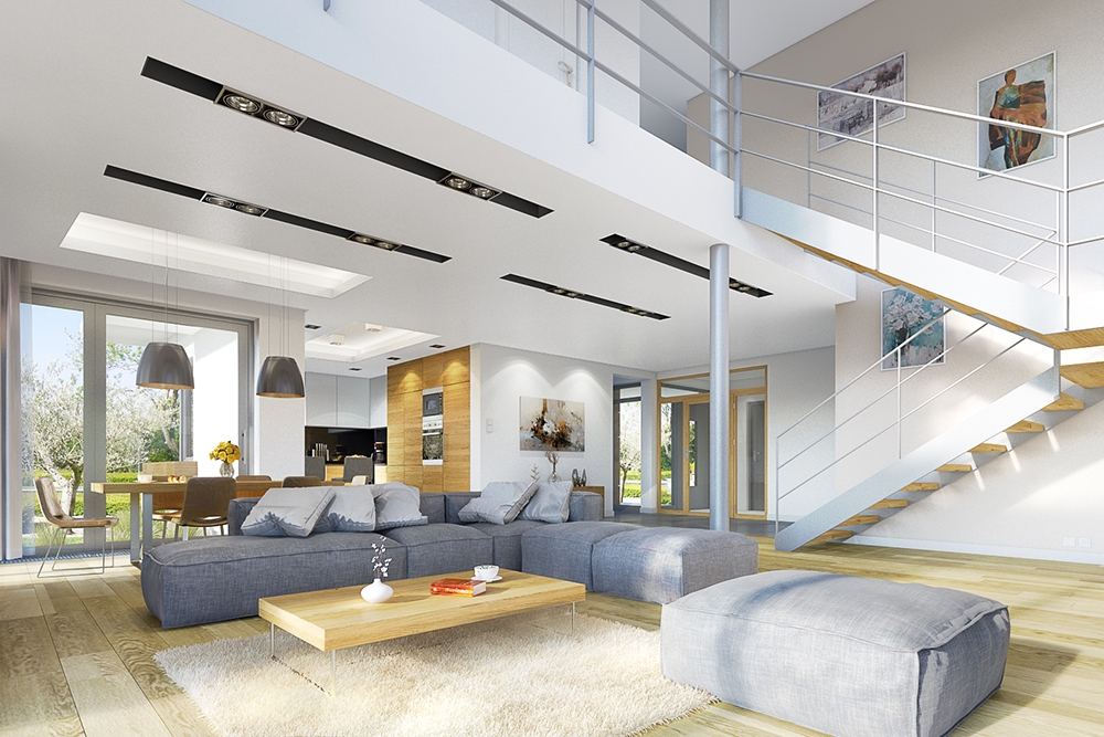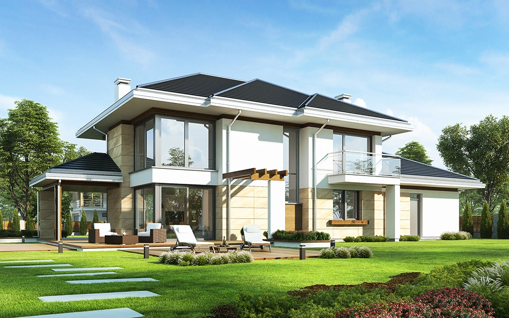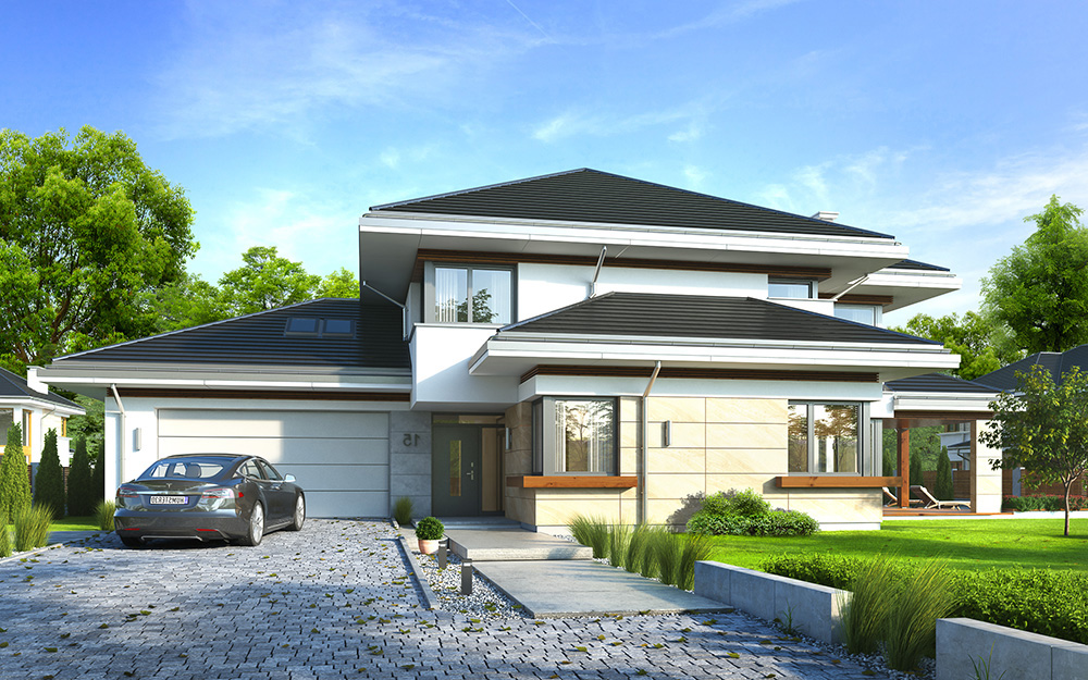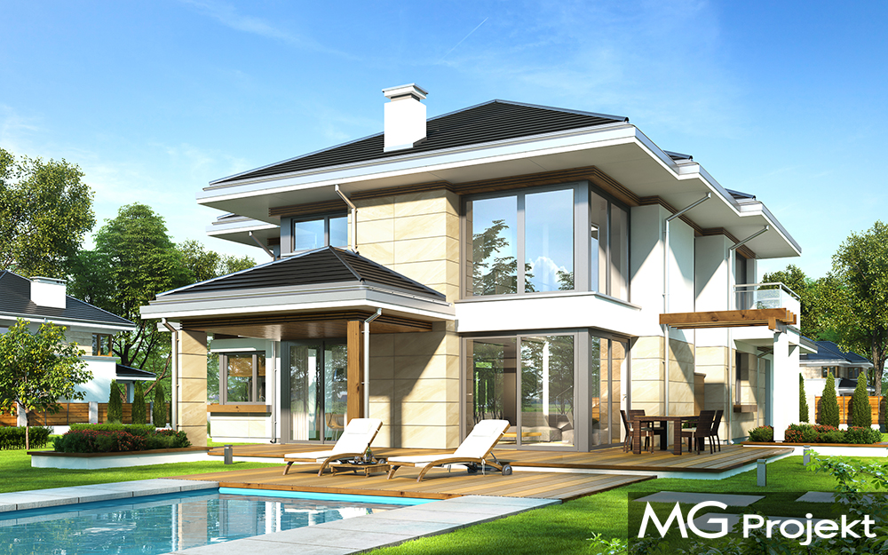 House with view 6 is another version of the popular series House with view. This is a variant with a completely different interior design. Namely, the living area, living room and terraces are located in the back of the house. Therefore, the house is perfect for a classic plot with a garden behind the house and entrance and entry to the plot from the sunniest part of the plot. House with a view 6 is a unique project. It combines all the interesting elements of its predecessors, but it also has additional attractions, giving together a successful proposal of a beautiful modern villa. As in the other houses with a view, the storey core of the house is enclosed here with smaller blocks. The entire building is covered with multi-pitched gentle roofs with wide eaves. The leitmotifs are corner large windows - glazed living room, dining room, kitchen. A glass, two-storey corner of the living room with emptiness, adorns the rear facade - garden this time. The house is varied with stone and wooden wall claddings, as well as with roofs, balconies and pergolas above the terrace. The interior is very interesting. The central part of the ground floor is a beautiful living room, with a void above its fragment, and above the stairs that are the decoration of the interior. From the entresol upstairs, we can admire the living room and the garden view. We get to the house with a glass corner entrance to the vestibule, and from there to the hall and the living room. At the entrance we have an additional room - a study room, and on the opposite side of the hall there is a bathroom with a laundry room. From the vestibule, we can go to the garage and utility rooms with a boiler room. A nice kitchen with an extra pantry is available from the lobby and dining room. Terraces around the living space are arranged in the letter L - part of the terrace is roofed. The first floor has three bedrooms and a large central bathroom. Parents' bedroom and one children's bedroom has a dressing room. Second children's bedroom has built-in wardrobe. A part of the floor area is occupied by a entresol and opening on the ground floor. Above the garage there is an attic available from the lobby. House with view 6 is slightly smaller than its predecessors, but thanks to it cheaper to implement. At the same time, the house does not lose its attractiveness and the spaciousness of its interior. The project is an excellent offer for investors dreaming about a representative, elegant, storey house, with modern architecture, and a functional and original interior. There is also a version of the house in the mirror image (garage on the right), basic version (House with view), version reduced to 221m2 (House with view 2), and the version reduced by 30% and cheaper to implement (House with view 3)
