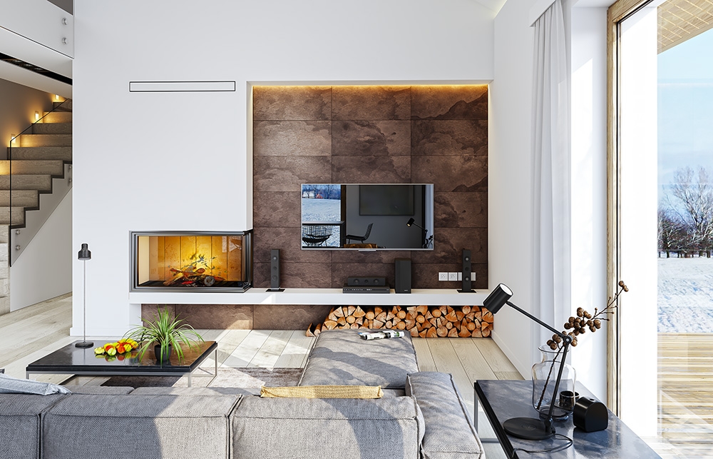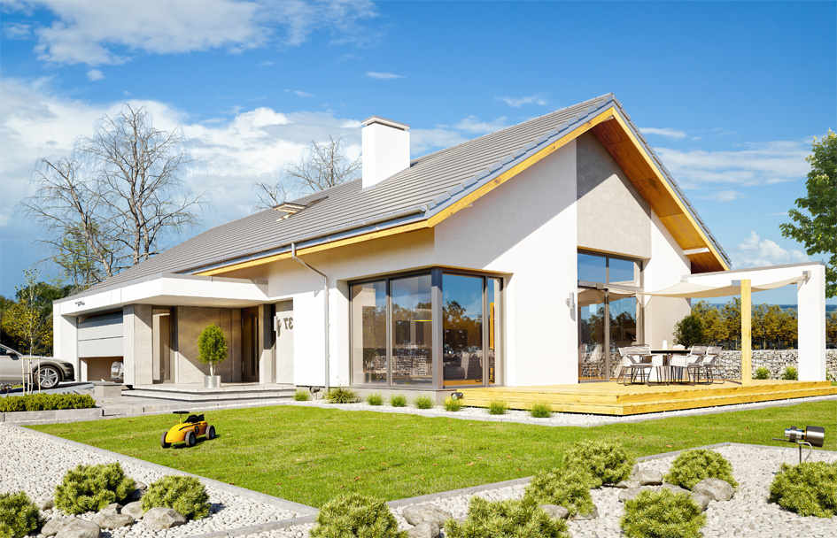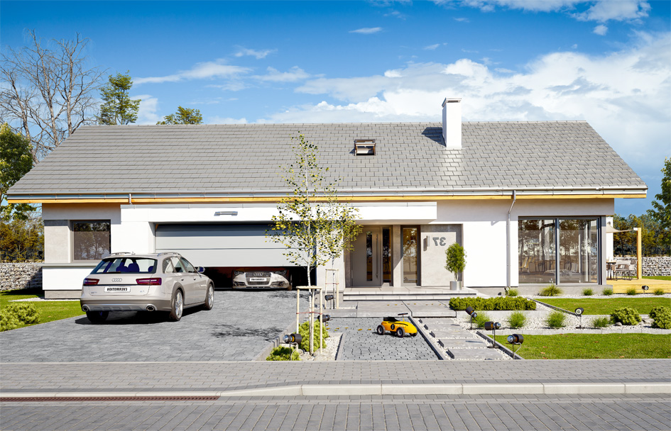 Dream house plan is a basic version from the series of our "Dream Houses". The house is designed for a family of four. A rectangular building with a partially protruding garage. The house is crowned with a gable roof with an angle of 30 degrees. The project combines the simplicity of construction and solid, with interesting details and architectural solutions, creating an extraordinary and original effect. The modern stylistics of the design, obtained by the appropriate selection of materials, cladding, the use of large glazing, opening the interior to the surrounding garden. The main elements that give character to the shape are: a garage with a roof over the entrance arcade protruding from the front wall, a beautifully accented entry door with transoms, and a terrace section extending the living room, which thanks to the location on the side of the building makes the house perfect for various plots - including those with entry from the south. The "Dream" living room is illuminated on three sides, so the house can be located on a plot with a garden on the side or back. The interior of the house: The original garage location, in the central part of the block, allows easy communication access between the garage, vestibule and boiler room, which is rarely found in rectangular-shaped one-story houses (usually the garage is cut off from the block, or located behind the bedrooms). Here, the garage is in a perfect place - at the entrance, close to the lobby and the kitchen. The boiler room next to the living room and the fireplace makes us have one common chimney in the whole building. From the vestibule, we enter the lobby and the living area, with a nice kitchen with a peninsula, pantry, laundry and garden entrance. Next we have a living room with a raised ceiling. The void above the living room visually enlarges this beautiful room, and the high window at the top lets in a lot of light and opens the living room to the garden and terrace with a roof - a sail. On the other side of the house we have three bedrooms, a bathroom and a dressing room. Above the ground floor is designed ceiling and rafter roof truss, thanks to which there is an additional large attic - warehouse, for any arrangement. Of course, you can also re-design the roof structure for truss trusses and disable this space from any use. Dream house is a very comfortable, comfortable home for four people. He has everything a family can need. The building has a simple structure, it will be easy to build, and thanks to a compact body and great materials and insulation it is energy-saving and will be cheap to maintain.