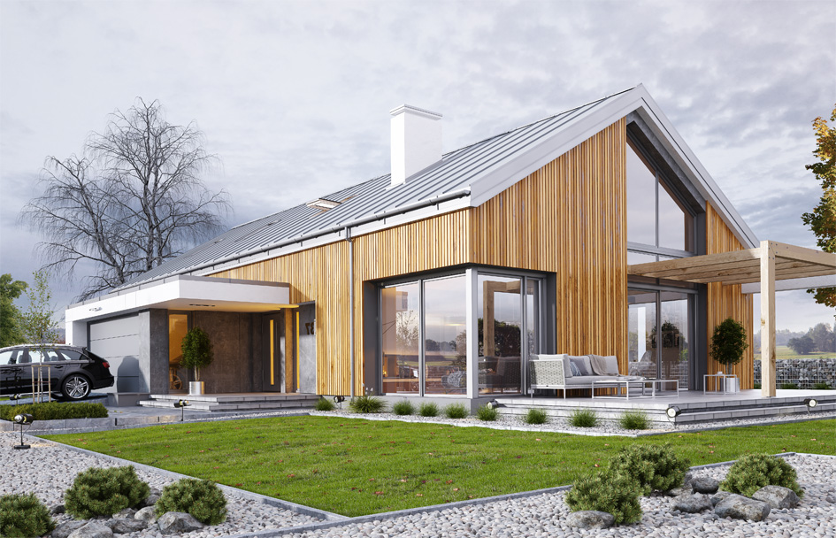 Dream 4 house plan is another proposal from a series of Dream 4 houses - a one-storey building with an attic for development, built on a rectangular plan, with a garage part protruding on the front, covered with a gable roof with a 35-degree angle of inclination. The project is maintained in a modern style of a house-barn, more and more often chosen by investors. The roof of the building has no hoods, the roofing is designed from standing seam sheet, and the external walls are finished with a vertical cladding of wooden squared timber. This combination of materials, combined with the surfaces of concrete imitating panels, and grey window frames creates a very attractive appearance of the building. The main stylistic details are: a protruding garage, an entrance gate and a representative front door with transoms. At the top of the house, in turn, a two-storey window of the living room and a terrace partially covered with a pergola. Thanks to the location of the terrace on the side of the building, the house is perfect even for a plot with entry from the south. The living room in Dream 4 house plan is illuminated on three sides, so the building can be located on a plot with a garden on the side or back, or even from the front of the house, in the corner of the plot. Interior: the original location of the garage, in the central part of the block, facilitates communication between the garage, vestibule and boiler room, which is rare in one-story houses with a rectangular shape. The garage is in a perfect place - at the entrance, close to the hall and the kitchen. The boiler room next to the living room and the fireplace makes us have one common chimney in the whole building. From the vestibule, we enter the lobby and the living area of the interconnected rooms of the dining room and kitchen. The kitchen is separated from the dining room by a peninsula with a barge. From the kitchen we have access to the pantry, laundry and business exit to the back of the house. The living room is lit from each side, and opening the ceiling above the living room increases its height creating an attractive space with a mezzanine in the attic. On the other side of the house we have three bedrooms, a bathroom and a dressing room. Above the ground floor is designed attic, with a mezzanine above the living room enlarging its space and with an additional attic space that can remain a non-usable attic (home storage), or it can be developed into utility rooms - according to the wishes and needs of the owners. Dream 4 house plan is a comfortable, comfortable and modern villa for a family of four - functional and practical. The building is energy-saving, has a simple construction, will be easy to build and cheap to maintain.