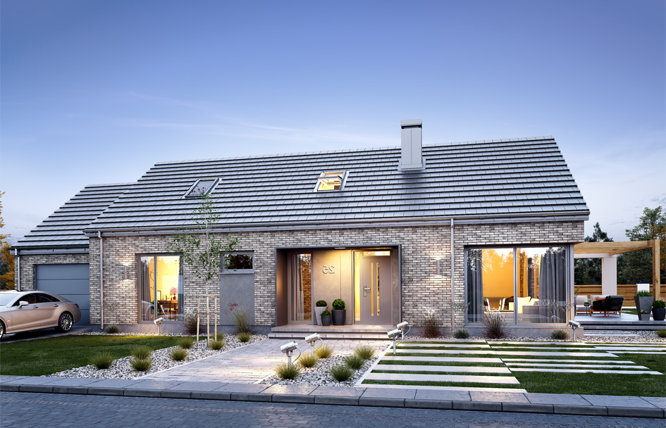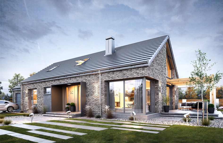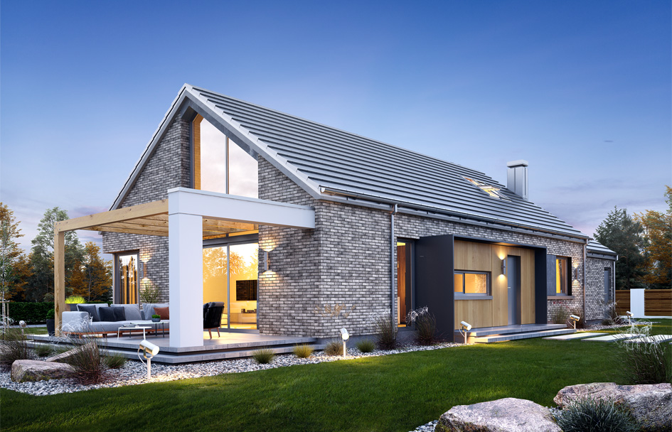 Dream 9 house plan next house from a series of Dream houses from our studio. The building was designed in a fashionable house-barn style. The house is one-story with an attic. It was covered with a gable roof with an inclination of 35 degrees. The roof has no hoods, the shape is maximally simple, modern, with boxed roofs concealed from the front and back, concealing the entrance and the bay window of the kitchen. The project uses interesting details and materials to enhance the appearance. First of all, the character of the building is formed by clinker cladding on the walls, combined with grey inserts, grey window frames and grey - graphite tiles. The combination of materials and details used has created a successful visual effect. The house is modern, simple and at the same time elegant and representative. The main detail distinguishing the front elevation is the entrance part, with a platform, an interesting boxed roof and entrance doors with transoms. From the rear façade, this procedure was repeated in the kitchen bay. Undoubtedly, the most interesting is the top of the house with a window running through the entire height of the façade, which brightens the living room with a void and mezzanine, opening the interior to the terrace with a pergola and garden. The house is designed in such a way that the living room has lighting from three sides of the building, which allows you to locate it on an unfavorable plot - with entry from the south, or with a garden on the side. While designing the interior we tried to fit a comfortable four rooms + living room, and all necessary additional rooms. We enter the house with a comfortable vestibule right into the living area, with a living room, dining room and semi-closed kitchen. The kitchen is connected with a pantry, and a laundry room with an economic outlet to the back of the house. On the other side of the house we have three bedrooms, including a parents' bedroom with a wardrobe, a bathroom and an extra room - a study or an extra bedroom. Through a double door and an additional corridor, the house connects with the garage and boiler room. Above the ground floor there is an attic with a void above the living room, a mezzanine with stairs above the living room, and an additional attic-attic space that can be left as an attic (warehouse) or converted into additional utility rooms - according to the owner's wishes. Dream 9 house plan is a comfortable, comfortable house with modern and attractive architecture, designed for a family of four to five. The building is energy-saving, has a simple construction, will be easy to build and cheap to maintain