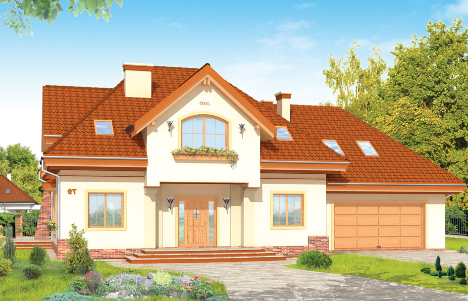 Edith house is a comfortable family house for a family of 4-5 people. This house has extensive the garage part with an attic that can be finished at a later stage. The house was designed on a rectangular shape covered by a hipped roof with large dormers. To the Edith house the garage part with a large attic for any use was built into. The architecture of the house is traditional, but includes also modern elements such as large glass living room, or finesse support arcades. On the ground floor there is a salon with dining area and a partially open kitchen, hall with ornate staircase, extra room and large utility room, with a large garage and boiler room. At the attic three bedrooms, one with private bathroom and dressing room was designed. The attic can be of course used e.g. for a gym or a sauna. This house is also available in a mirror version.