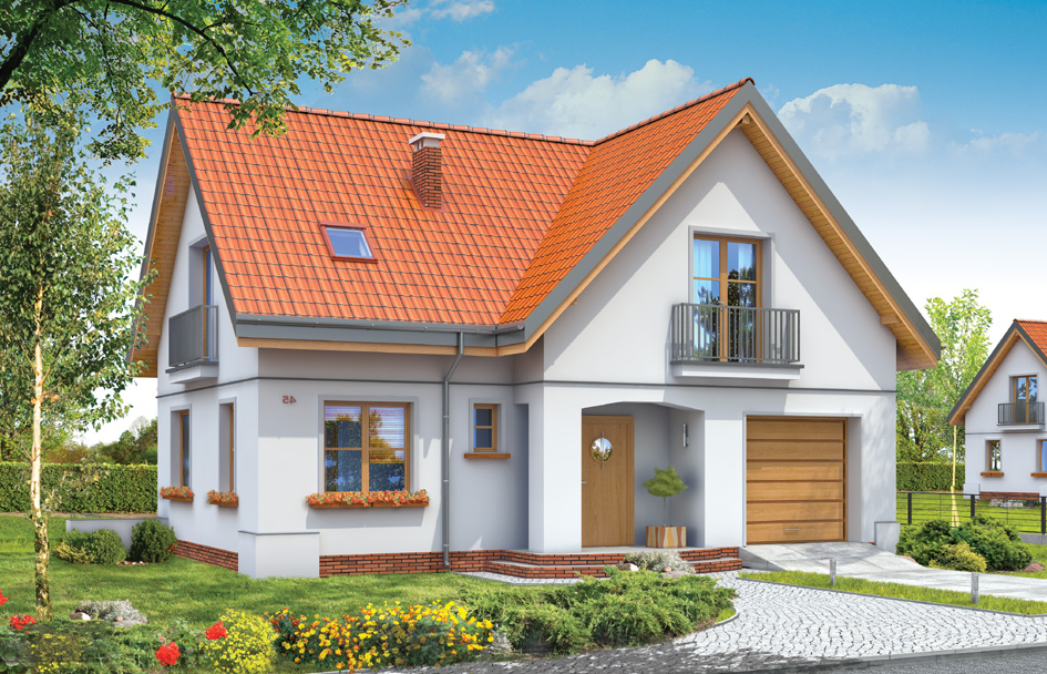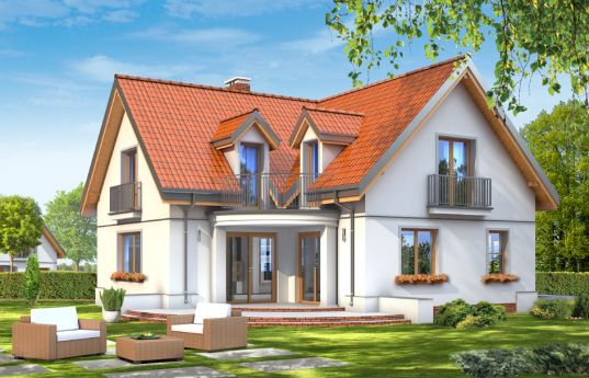 Elizabeth is a house for the family of 4 -5 people. Elizabeth is a storey house with usable attic, with a built-in garage for one car. The house has a shape of the letter "L" and is covered by a symmetrical gable roofs. Body of the building creates an intimate terrace corner from the garden side which is partly covered. The traditional form of home combined with frugal, contemporary details form consistent, very proportional external elevations. The arcade of the front door, the balconies and dormers diversified the body of the building. Large windows to the terrace provide good lighting and contact of the inside of the house and the garden. On the ground floor there is a daily space, with a separate living room, dining room, lounge and partially closed kitchen. There is also a place for the garage and boiler room. In the attic there are three large bedrooms with dressing-room, and a spacious bathroom. There is also a mirror version of this house plan.