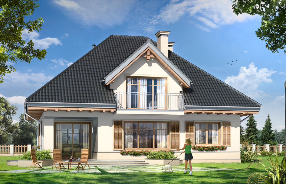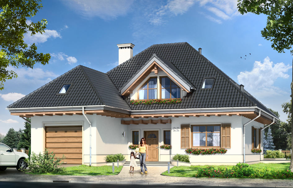 Fantasy house plan is a beautiful suburban villa with refined architectural details and functional interior. Fantasy house is a one-storey building, with an attic. It is designed for a family of 4 – 5 people. The main body of the building is covered with a hipped roof. The garage is composed to the building and two large skylights - from the front and from the garden was added. The shape of the roof, dormers, eaves, walls of the ground floor with a wide belt of foundation, massive chimneys - all these elements evoke the memory of the pre-war houses - robust and long-lived, ingrown in the environment. The combination of historical details and modern materials create a harmonious whole. The interior of the house is divided into a living area on the ground floor and bedrooms on the top floor. At the bottom of one living space create living room, dining room, lounge with beautiful exhibited staircase and central fireplace, and partly open kitchen. An extra room by the stairs can be used as an office or bedroom. In this house plan, on the ground floor also planned garage, utility room - boiler room and porch. In the attic three very comfortable and spacious bedrooms was designed. Parent’s bedroom - is a separate apartment - with a balcony overlooking the garden, private bathroom and a large dressing room. Children’s bedrooms have en-suite bathroom and large cavity built-in wardrobe. From one of bedrooms you can get to the attic over the garage. The interior of the house is connected to the garden through large windows and a wide exit to partly covered terrace. We also have the Fantasy house plan in a mirror version.