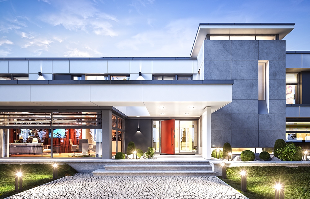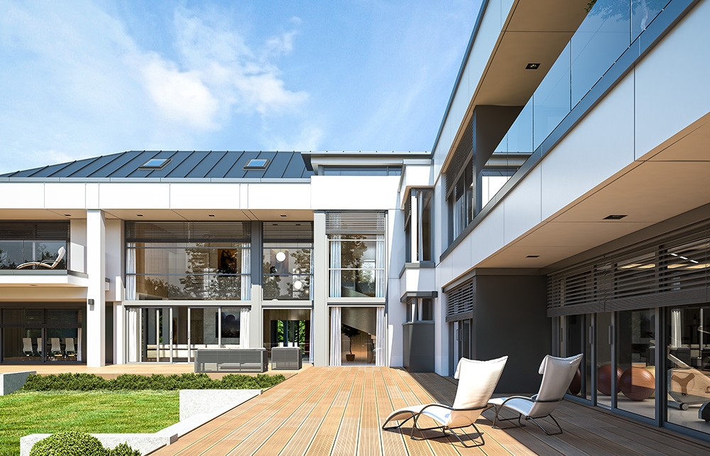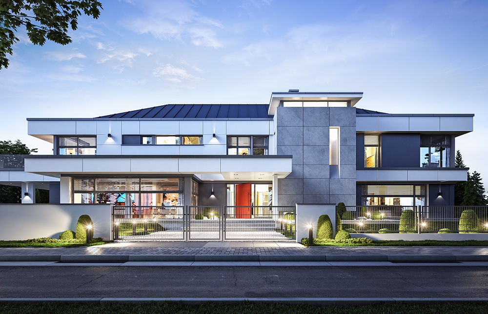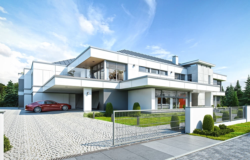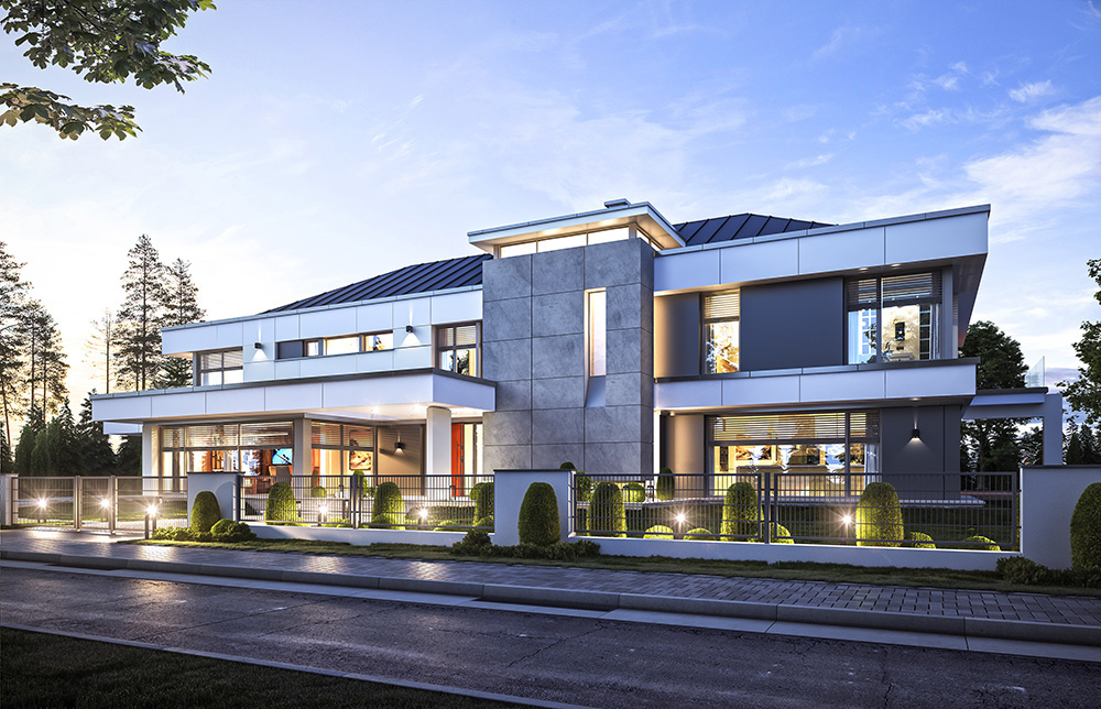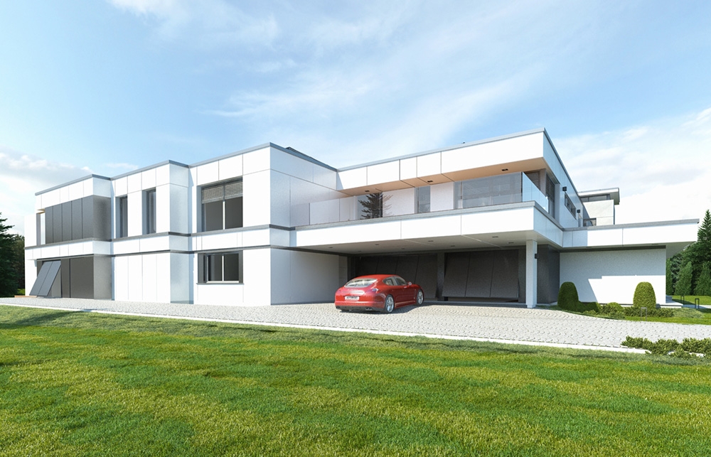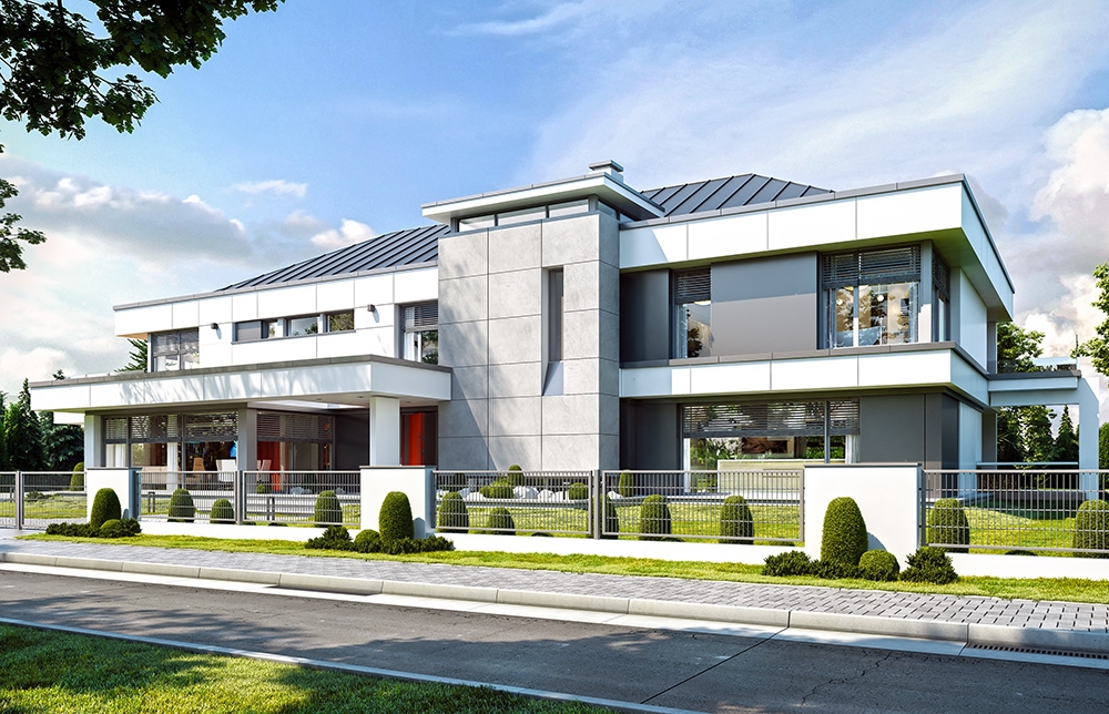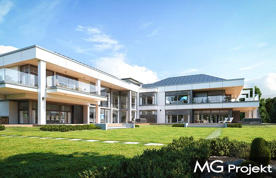 Florida Residence house plan is a project of a luxury residence, our largest offer from the series of Florida Willa houses. This time, due to the size and unique style of the house, he received the well-deserved name Florida Residence. This house is a truly luxurious, extremely comfortable residence - an apartment for any large family. The house have a large area. It is the fulfillment of the dream of a super luxury home, in which the residents will always feel comfort, space. The house is a modern villa. The facades of the house are open with large glazed windows to the garden. This is not a home for modesty. The house consists of two blocks, connected and forming the letter L, closing the extensive terraces and garden in a small enclave. A representative entrance directs us straight to the interior of the house. From the entrance we see a two-storey living room with large glazed windows that open the interior to the garden. To the left we have a kitchen, a dining room and a set of auxiliary rooms. At the entrance to the right we have a beautiful office. Next, we go to a very large garage with a shed, utility rooms, and - in the second block, to the extended part of the recreation and sports part, with a gym and mini Spa. On the first floor we have several separate children's apartments and for guests, and a luxury parents' bedroom, with a wardrobe. The Florida residence is certainly a house for people with a really thick wallet. If you decide to build a house you will have big and luxury house.