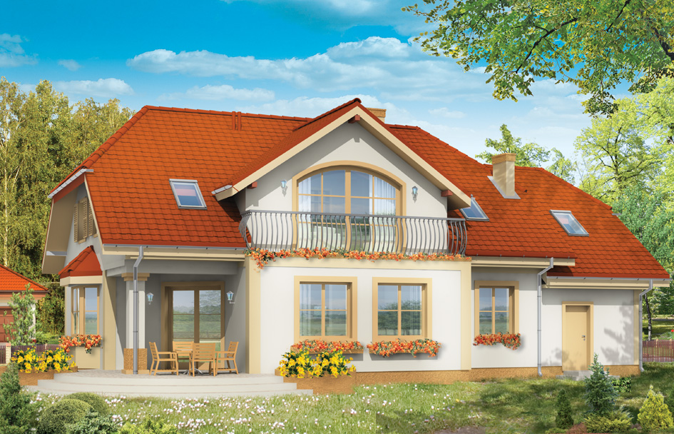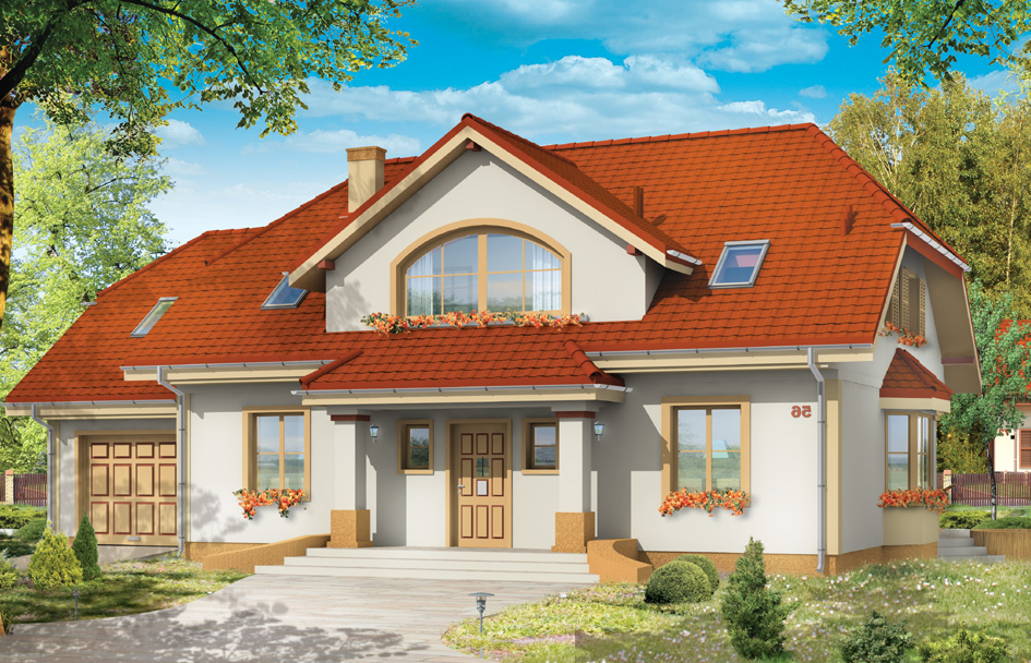 Focus house plan is the story house with usable attic for a family of 4 - 5 people. Focus house plan is a variant of the popular house plan Favourite - this time designed as a building with a gable roof and pediments. Often gable roof is one of the requirements set by the departments of architecture issuing building permits. This house plan is a complement of idea for the interior and functional layout of Favourtie house plan. The house was decorated with pediments so that the bevels pitched roofs somewhat mitigate the side peak walls. Inside, on the ground floor there is design a single-space living and dining room – with the exit to the arcade corner garden. The lounge is combined with a lobby with exposed staircase, and a partially open kitchen. On the ground floor there is also except a boiler room and garage, extra room and bathroom. In the attic three are large bedrooms with dressing rooms and a very nice bathroom. The attic above the garage can also be used for utility purposes - for example it can be adapted as a room.