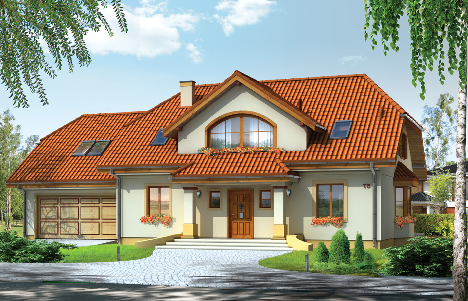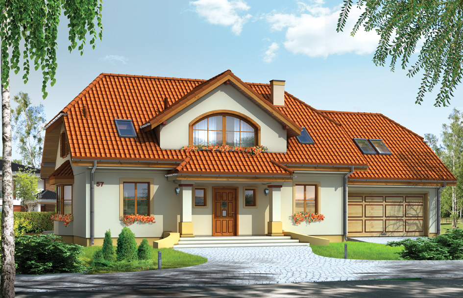 Focus 2 house plan is the next variant version of the Focus house plan - with double garage and an extended attic over the garage part. The building has been planned for a family of four-six people. Storey house with usable attic, covered by symmetrical gable roofs. Outside architecture of the house refers to the tradition of Polish manor house - in the modern sense. Compact form of house with an added garage part is decorated with a large front and rear dormers and balconies and with roofed entrance on the massive columns. Corner arcade from the garden is a diversity of the rectangular floor plan. The interior of the Focus 2 house plan creates one space on the ground floor living area, which consists of: living room, a dining room, a large hall with exposed stairs, and partly open kitchen. On the ground floor there are two additional rooms and a garage for two cars and a boiler room. On the top floor you will find three comfortable bedrooms with dressing rooms, spacious bathroom, and an attic, which can also be adapted for utility purposes. There is also a mirror version of the Focus 2 house plan.