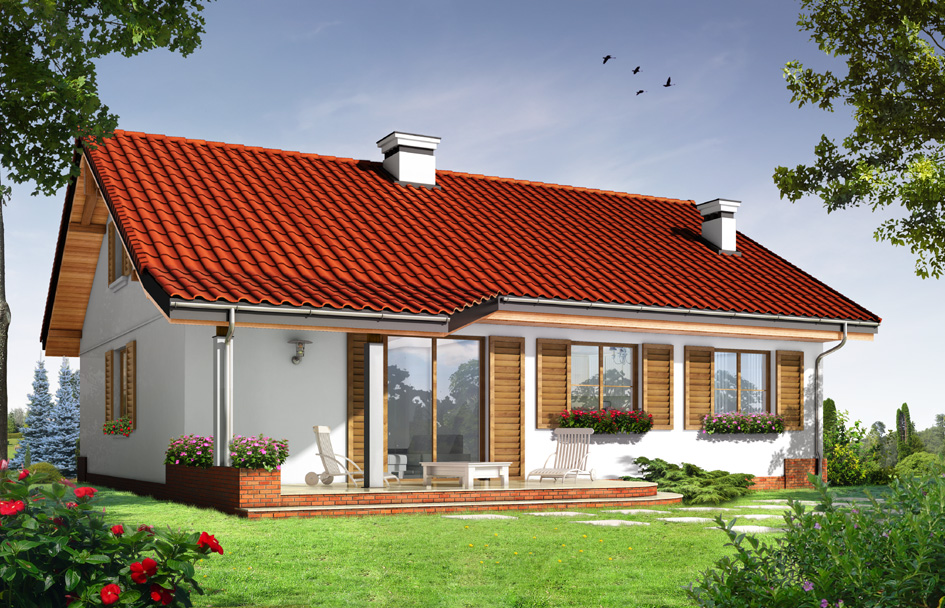 Forget-me-not house plan is a single-story house, designed for a family of four people. The rectangular shape of the building was covered by a gable roof. Not usable attic above the ground floor can be easily adapted to the attic. The project refers to the typical traditional style. Front of the house with accentuated entrance porch supported by two columns, with windows on the sides, reminds Polish manor house. Back elevation is rather functional with symmetrical layout - partially covered garden terrace is an extension of the living room. House interior was divided into a living area, with a living room, hall with partially open kitchen, and the night part with three bedrooms and a bathroom. In a small boiler room gas furnace can be easily installed. In the lobby next to the fireplace there are stairs to the attic. House is a great proposition for investors who want to inexpensively build a house, while leaving the possibility to finish in the second stage the additional space in the attic - or just have a big useful attic. There is also available a mirror version of the Forget-me-not house plan.
