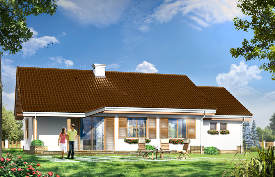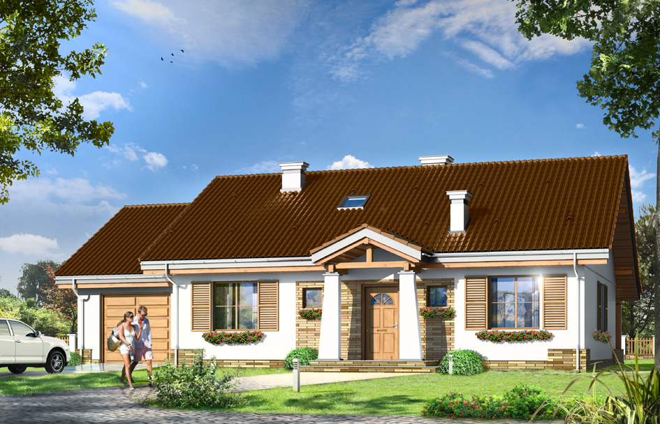 Forget-me-not with garage house plan is a variant version of Forget-me-not house plan. This single-story house, was designed for a family of four people. The rectangular shape of the building was covered by a gable roof. Not usable attic above the ground floor can be easily adapted to the attic. The project refers to the typical traditional style. Front of the house with accentuated entrance porch supported by two columns, with windows on the sides, reminds Polish manor house. Back elevation is rather functional with symmetrical layout - partially covered garden terrace is an extension of the living room. House interior was divided into a living area, with a living room, hall with partially open kitchen, and the night part with three bedrooms and a bathroom. In a small boiler room gas furnace can be easily installed, or you can move the boiler room to the room behind the garage and put there a solid fuel boiler. House is a great proposition for investors who want to inexpensively build a house, while leaving the possibility to finish in the second stage the additional space in the attic - or just have a big useful attic. There is also available a mirror version of the Forget-me-not with garage house plan.