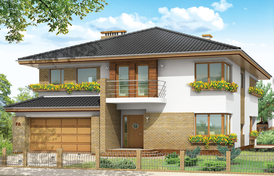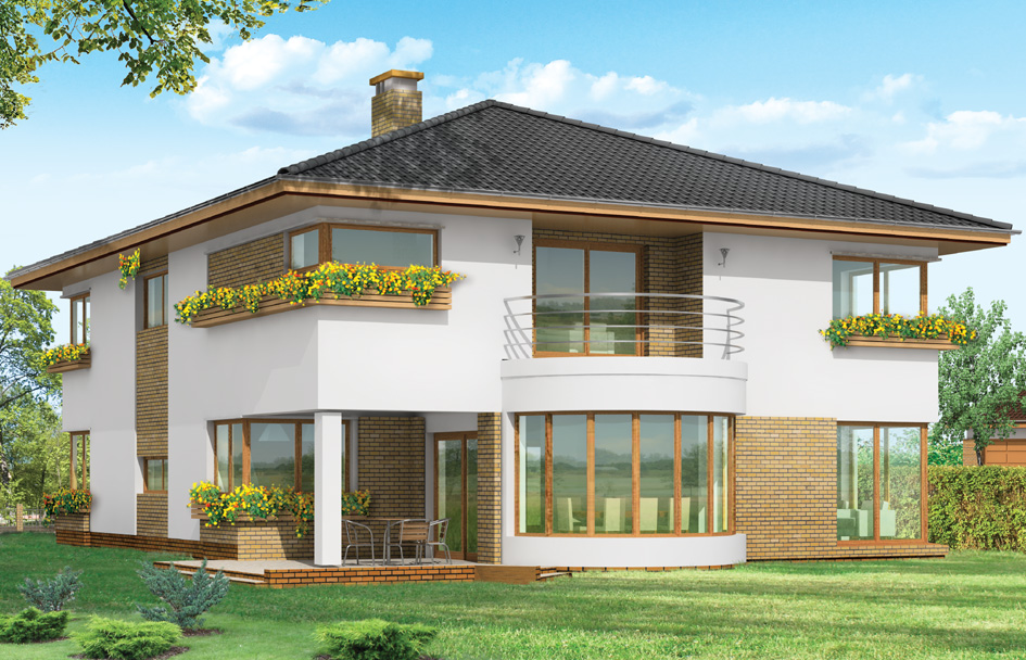 Gabriela's house plan is a prestigious villa, with one-storey block covered with a hipped roof. House is designed for a family of 4 – 6 people. The architecture of Gabriela's house refers to the modernist style, in the modern sense. Elements such as corner windows, balconies with rounded railings, curved bay window of the dining room, the division of the facade into horizontal stripes create an interesting styling of external architecture of the building. For this house plan several different variants of the arrangement of the facade was provided. The interior of the house: on the ground floor living space consists of a living room, dining room with beautiful bay window, a spacious lobby with comfortable stairs to the first floor, large kitchen with kitchenette for quick meals. From the living room we go to the arcade and on the terrace. On the ground floor there is also designed an office room, garage and boiler room. On the first floor there is a parent’s apartment with bathroom, dressing room and terrace overlooking the garden; three bedrooms for children with bathroom, a laundry room and sports room. This house plan is also partial basement - cellar accessible from outside the house, by the steps from the garden. You can resign from the basement if the ground conditions do not allow for its construction. Gabriela house plan is also available in mirror version.