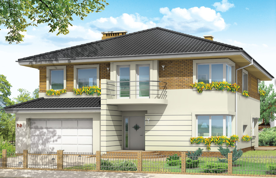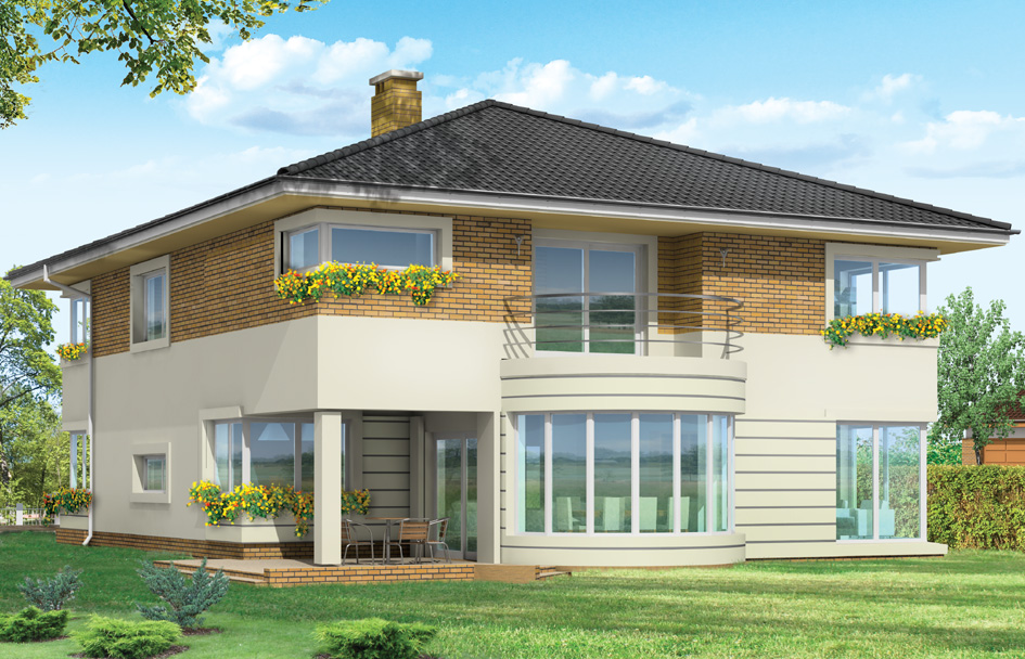 Gabriela 2 house plan is a prestigious house, with one-storey block covered with a hipped roof. The house is designed for a family of 4 – 6 people. The architecture of Gabriela 2 house refers to the modernist style, in the modern sense. Elements such as corner windows, balconies with rounded railings, curved bay window of the dining room, the division of the facade into horizontal stripes create an interesting styling of external architecture of the building. For this house several different variants of the arrangement of the facade was provided. The interior of the house: on the ground floor living space consists of a living room, dining room with beautiful bay window, a spacious lobby with comfortable stairs to the first floor, large kitchen with kitchenette for quick meals. From the living room we go to the arcade and on the terrace. On the ground floor there is also designed an office room, garage and boiler room. On the first floor there is a parent’s apartment with bathroom, dressing room and terrace overlooking the garden; three bedrooms for children with bathroom, a laundry room and sports room. This house plan is also partial basement - cellar accessible from outside the house, by the steps from the garden. You can resign from the basement if the ground conditions do not allow for its construction. Gabriela 2 house plan is also available in mirror version.