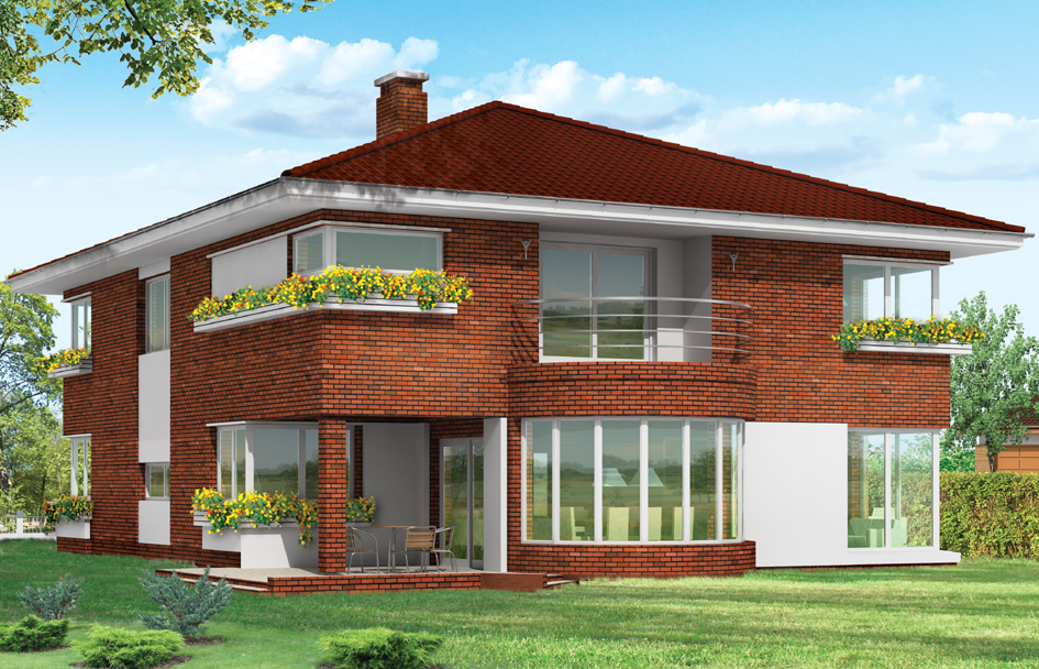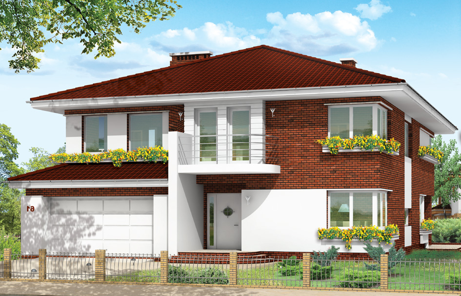 Gabriela 3 house plan is a prestigious house, with one-storey block covered with a hipped roof. The house is designed for a family of 4 – 6 people. The architecture of Gabriela 3 house refers to the modernist style, in the modern sense. Elements such as corner windows, balconies with rounded railings, curved bay window of the dining room, the division of the facade into horizontal stripes create an interesting styling of external architecture of the building. For this house several different variants of the arrangement of the facade was provided. The interior of the house: on the ground floor living space consists of a living room, dining room with beautiful bay window, a spacious lobby with comfortable stairs to the first floor, large kitchen with kitchenette for quick meals. From the living room we go to the arcade and on the terrace. On the ground floor there is also designed an office room, garage and boiler room. On the first floor there is a parent’s apartment with bathroom, dressing room and terrace overlooking the garden; three bedrooms for children with bathroom, a laundry room and sports room. This house plan is also partial basement - cellar accessible from outside the house, by the steps from the garden. You can resign from the basement if the ground conditions do not allow for its construction. Gabriela 3 house plan is also available in mirror version.