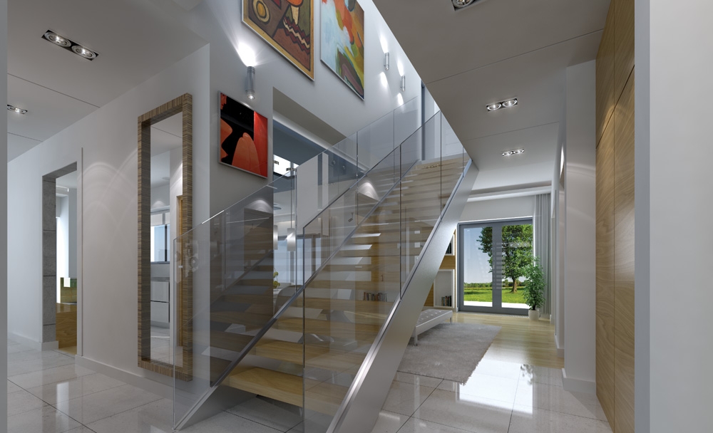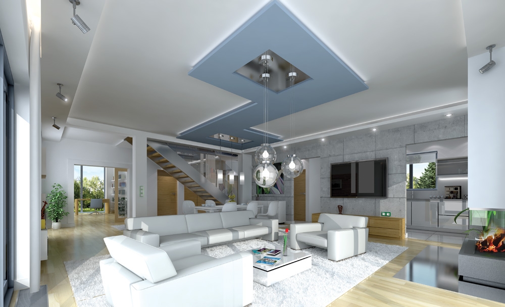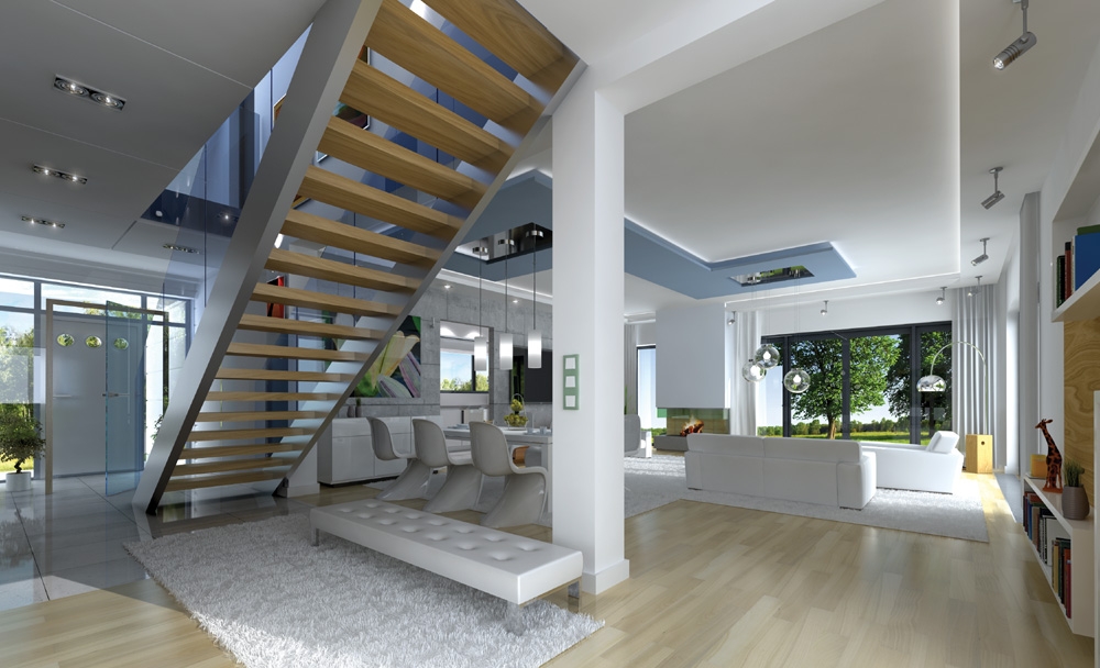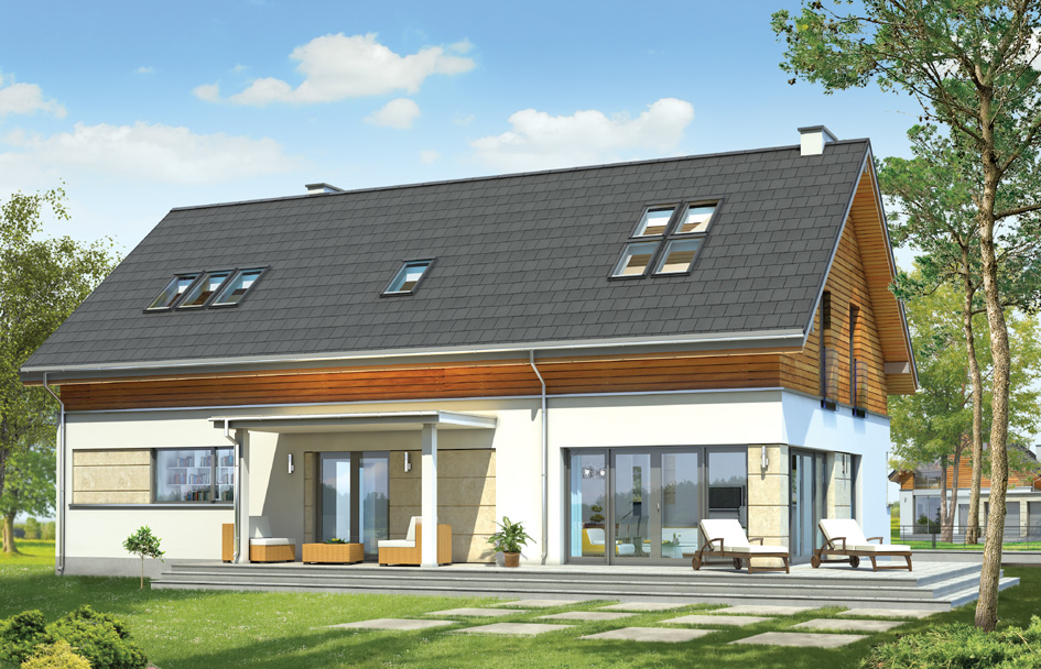Gala house plan is a convenient, modern villa for four to six people. Solid of the building is designed as a single-storey with an attic. The house has a rectangular shape and it is covered by a gabled roof, with added one –storey garage extension, entry, or arcade at the garden terrace. Gala combines traditional form of avant-garde, modern solutions of the materials used, flat roofs, or large glazed opening inside the garden. Thanks to this architecture, the house is well presented among trendy urban villas as well as on a typical Polish village. The interior of the house on the ground floor was divided transversely to the body by a lobby with a single-speed, very attractive stairs. On one side was planned living area comprising living room, dining room, kitchen, on the other – the utility part with a garage and a boiler room, and an additional room or office. At the attic there are children's bedrooms with wardrobes and a bathroom, and a suite for parents with bathroom and dressing-room. Gala house plan is also available in mirror version. There is also the opportunity to purchase this house plan in a NF40 standard.