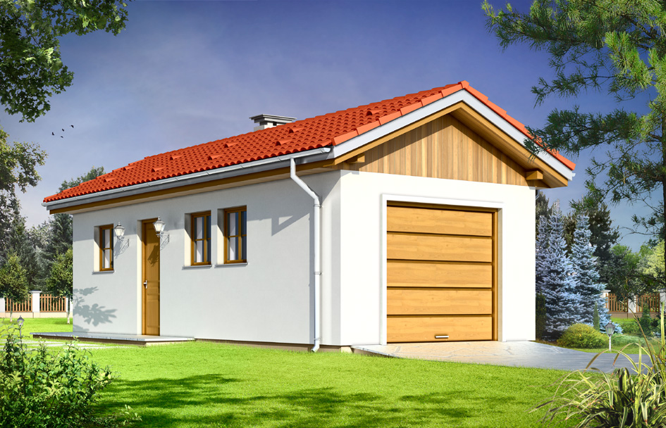 Single garage with utility room at the back (also available as an outbuilding) covered with a gable roof with an additional output from the side elevation.