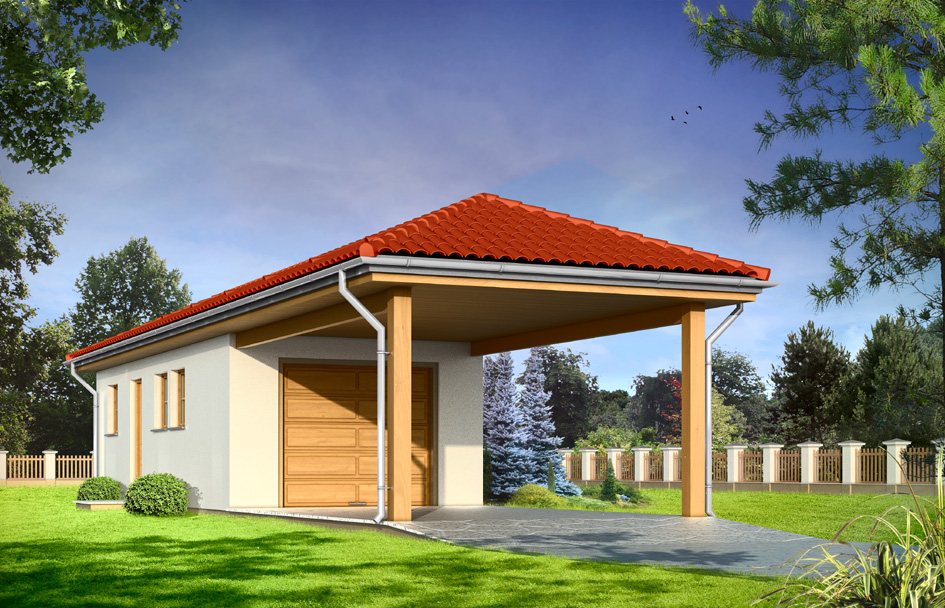 Single garage with utility room at the back (also available as an outbuilding) covered with a hipped roof with an additional output from the side elevation and with a carport in the front acting as extra parking position.
