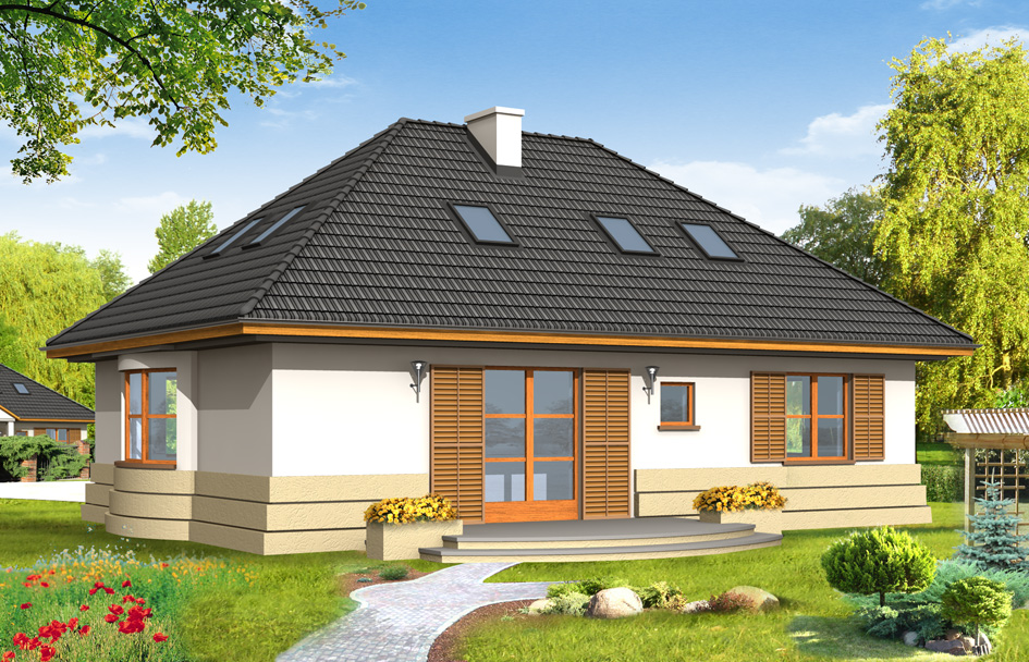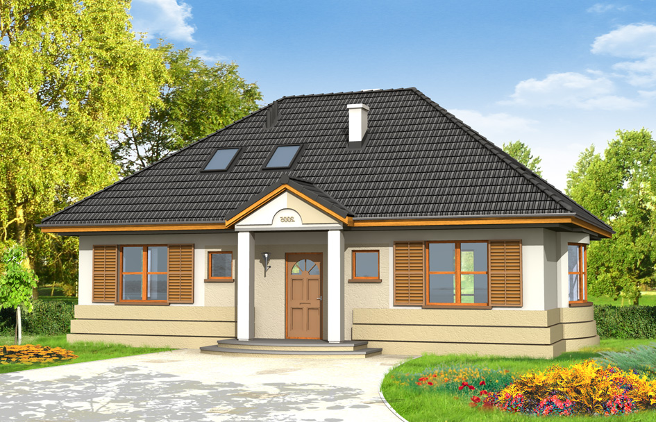 Gargamel house plan is a detached house referring to the form and style of Polish manor. Inside hides a modern interior layout for a family of 4 – 5 people. The building has a hipped roof, front entrance with columns and plinth with rustication expanding downward give the block of house seriousness and reliability. The interior of Gargamel’s house create a comfortable living room with a terrace, a dining room with nice bay window partly open kitchen with a very useful utility room, and in the second wing of the house two rooms with bathroom and dressing room. On the top floor there are two bedrooms with bathrooms. The attic can be finished in the second stage of construction. Gargamel’s house plan is also available in mirror version.