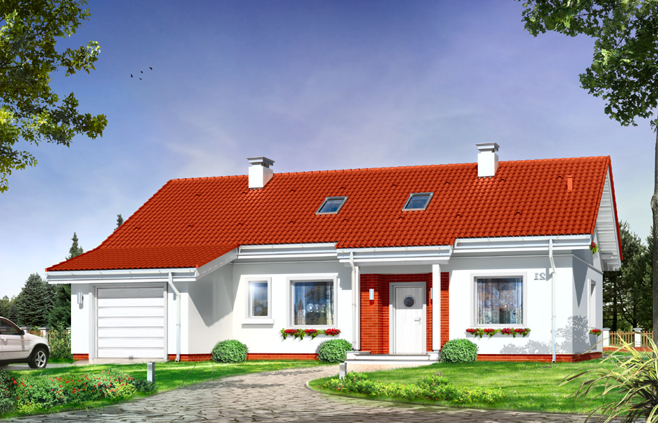 Glow house plan is a storey family house, built on a rectangular plan, covered by gabled roof, with the garage partly embedded into the body of house. This house plan is designed for a family of four people which will need with time more space for additional rooms thanks to the attic to adapt. Unpretentious modern architecture of one-story house, combines traditional form and modern materials, color and detail. The whole creates a modest, but very sympathetic look. The interior of Glow held at the ground floor, separating it into a living part - a living room, hall and partly open kitchen with pantry, and night part - with three bedrooms and a bathroom, and utility room with a garage and boiler room. In a small space we managed to organize spacious and comfortable accommodation for the household. From hall by stairs we get into the attic, which in a second step could be developed to loft with additional rooms. Glow house plan is the perfect choice for those who appreciate the convenience of an apartment on the ground floor but want to have a "reserve" space for use as an attic. This is grate project for people wanting to build a cheap, economical and energy efficient house. We has also a mirror version of the Glow house plan.
