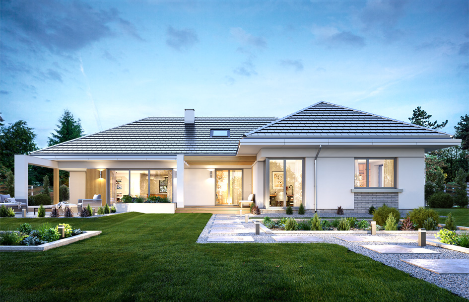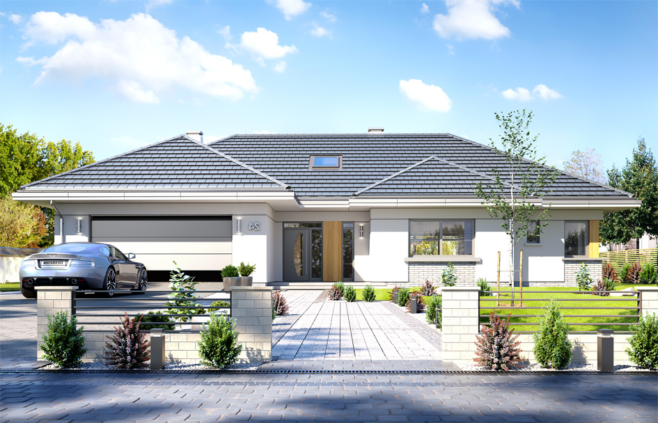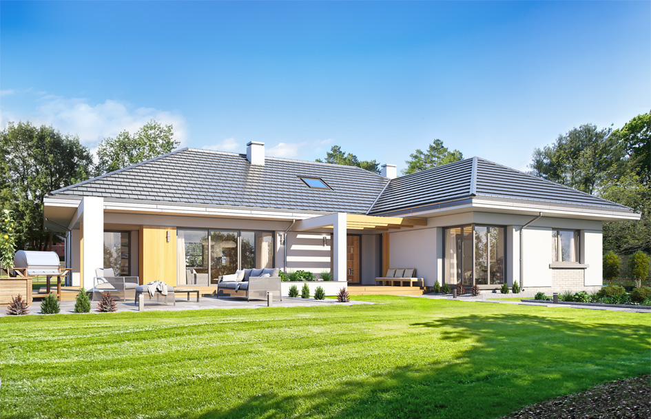 The ground floor villa is a representative one-story single-family house for a family of 4-5 people. A real comfortable villa for investors determined to live on the ground floor - without running up the stairs. The house, although it is not large and its usable area is just over 170 m2, was designed with American panache. From the very entrance we are welcomed by a wide, impressive front elevation, with beautifully accented entrance doors. From the garden side is even better - arranged in the letter L solid with a terrace - with an inner patio, partial roofing and pergola. Great place for home parties, but also for a quiet evening after work. We designed the building on the T-plane plan, with the main rectangular block covered with a hipped roof and built-up parts of the garage and bedroom. The style of the house is moderate modernity. Thanks to the large glazing, colors and materials used, the house looks modern but not extravagant. We enter the interior through the vestibule to the lobby and from there to one side to the living area - with a beautiful living room, dining room and kitchen, and the other side to the night part of the house. The living room with a fireplace and TV wall is connected to the terrace with wide sliding glazing. The living room was designed with a spatial opening - emptiness. In the version with developed attic in the attic we have above the balustrade and mezzanine. In the version with no use attic - just the empty space above the living room. In the dining room we have an entire wall on the sideboard - a rare convenience. The kitchen is designed a large island, and next to the kitchen room pantry and laundry - in American, the lady of the house has all the equipment at hand. In the night part there is a parents' apartment with a wardrobe and a bathroom, two children's bedrooms with built-in wardrobes and a bathroom, and an additional room that can be a bedroom or a study. A double garage and boiler room are also planned from the front of the house. The attic can remain a non-usable space - a home storehouse of various things, or it can be adapted to the usable area, thus obtaining an additional ca. 35 m2. A one-story villa is a great proposition for investors dreaming about contact with the garden and nature, about the comfort of living on one floor - without going up the stairs. Certainly, the house is designed for people with a slightly larger plot - a minimum of about 700-800 m2. We designed the building as energy-saving. The construction of the house is uncomplicated and the house will be inexpensive to operate.
