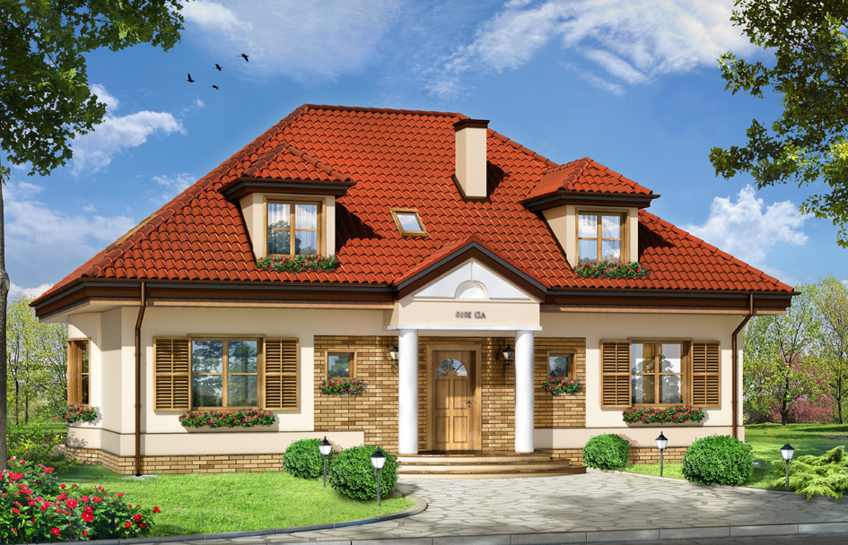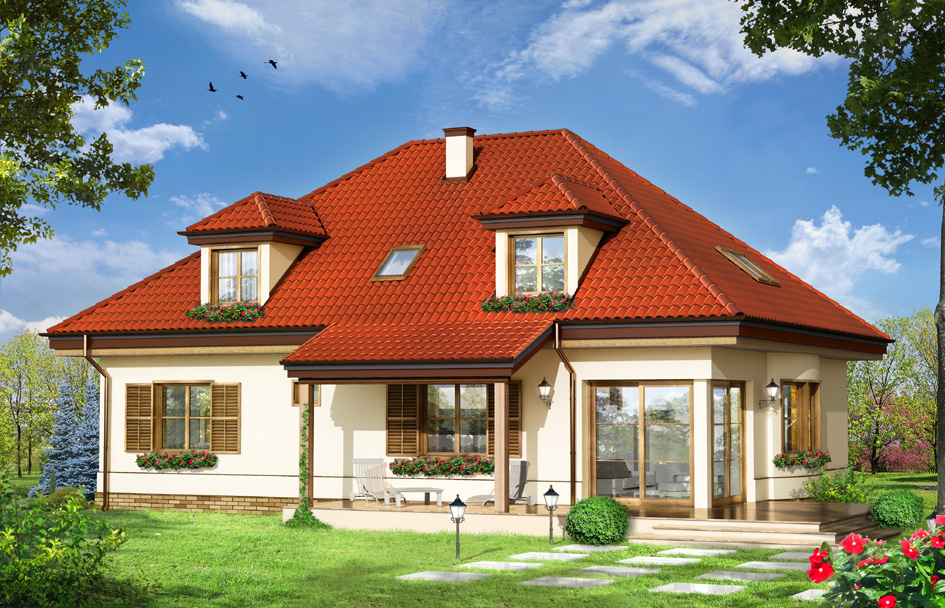 This is a one-storey house a loft covered with a hipped roof. House is partial basement and the economic base was placed there. Hetman house plan, its solid with symmetrical elevations refers to the Polish manor house, but in the modern sense. Breaking the monotony of the axial distribution of the interior even for a corner living room opening into garden and partly covered terrace, gives an interesting architectural effect. These elements give the house original, unique form, without affecting the increase in construction costs. The whole house was subordinated to the arrangement of the functional architecture of the interior. On the ground floor a living area with open space comprising: living room with dining area and lounge area, and partly open kitchen was designed. On the other side are two rooms and a separate bathroom. Rooms can be used as a separate flats for seniors, or as an additional rooms - office or guest bedroom. Opening the living room to the terrace and garden by the corner door will add charm to this large interior. On an attic four bedrooms and two bathrooms is scheduled. One of the rooms can be parent’s bedroom with dressing room and a bathroom. To the basement, which is designed as an open large technical room leads staircase available from the hallway on the ground floor. The partial roof terrace will also use it in bad weather, or too much sunlight. Hetman house plan is also available in the mirror version.